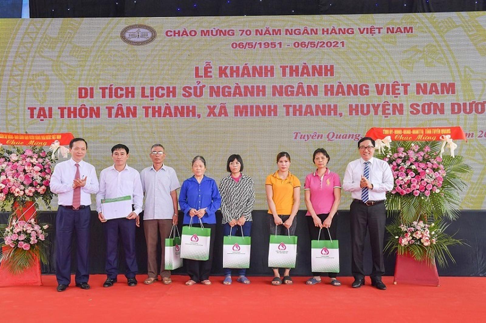 (Thanh tra) - Hòa trong không khí cả nước tưng bừng kỷ niệm 46 năm ngày Giải phóng miền Nam, thống nhất đất nước (30/4/1975 - 30/4/2021), hướng tới Kỷ niệm 70 năm ngày thành lập Ngân hàng Việt Nam (05/6/1951 - 05/6/2021), ngày 24/4, tại Tuyên Quang, ngành Ngân hàng Việt Nam (NHVN) tổ chức Lễ khánh thành công trình tôn tạo, mở rộng khu di tích lịch sử ngành Ngân hàng tại thôn Tân Thành, xã Minh Thanh, huyện Sơn Dương.