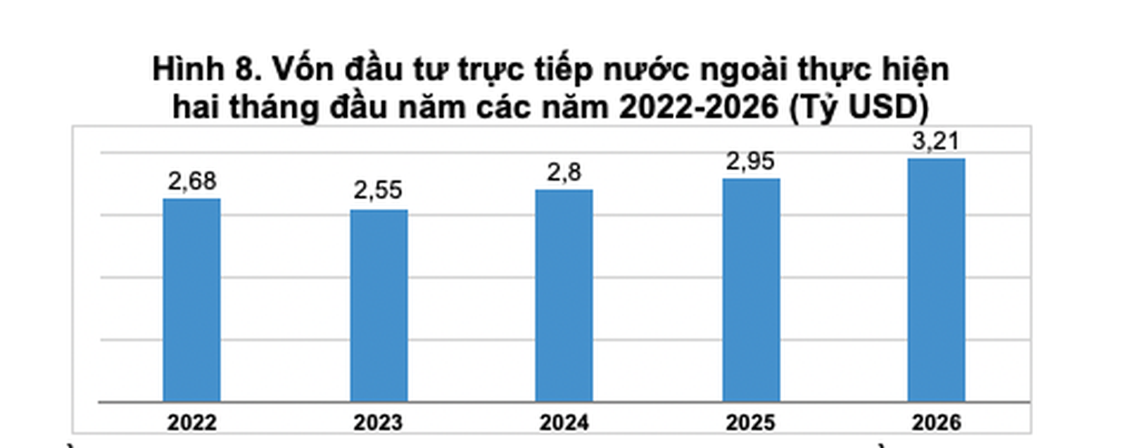 Vốn đầu tư FDI thực hiện tại Việt Nam 2 tháng đầu năm từ 2022 - 2026. Ảnh: Cục Thống kê