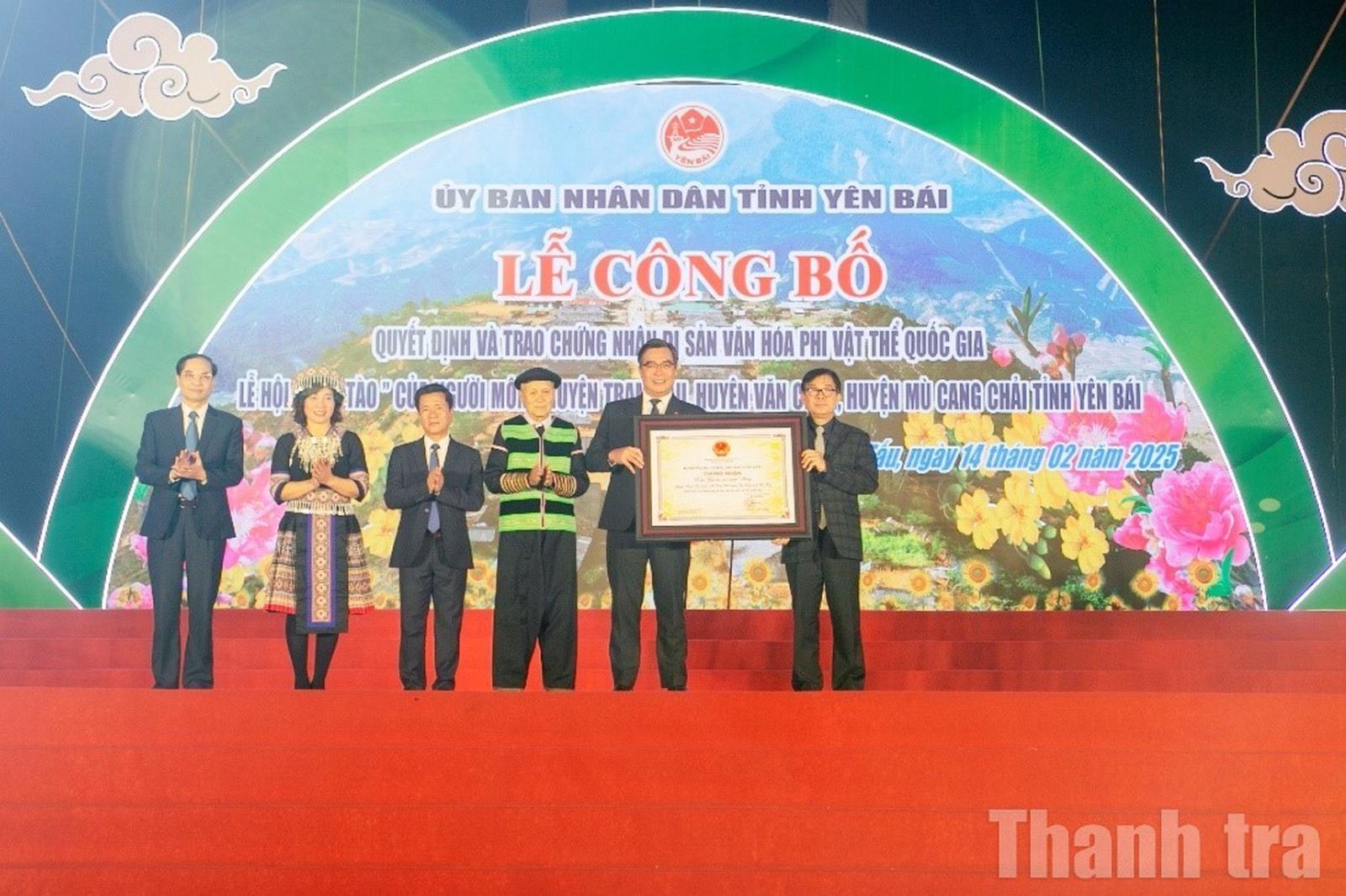 Ông Nông Quốc Thành, Phó Cục trưởng Cục Di sản Văn hóa trao Bằng chứng nhận cho ông Nông Việt Yên - Giám đốc Sở Văn hóa, Thể thao và Du lịch tỉnh cùng đại diện cộng đồng chủ thể Di sản văn hóa phi vật thể Quốc gia Lễ Hội “Gàu Tào”. Ảnh: Bình Yên