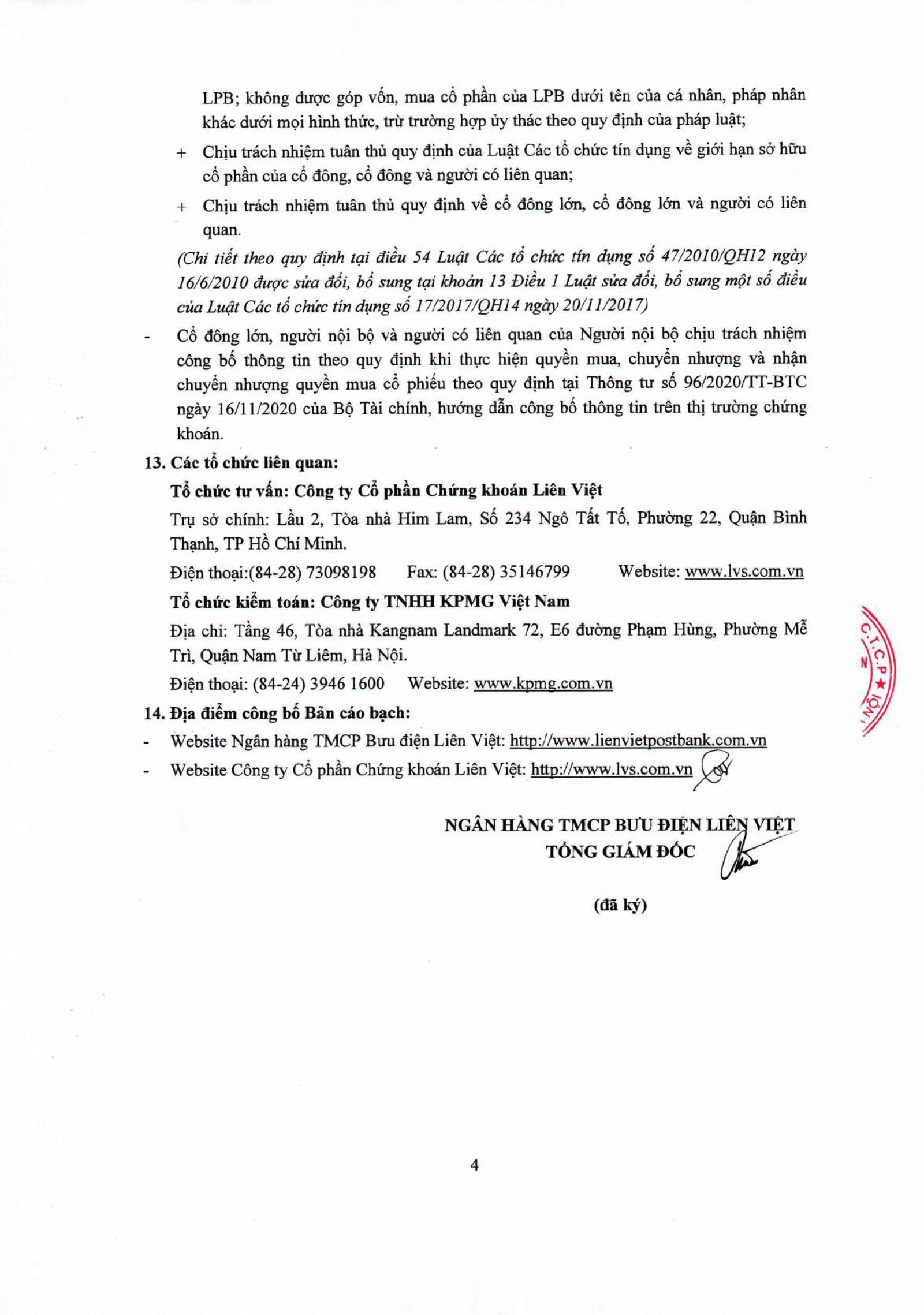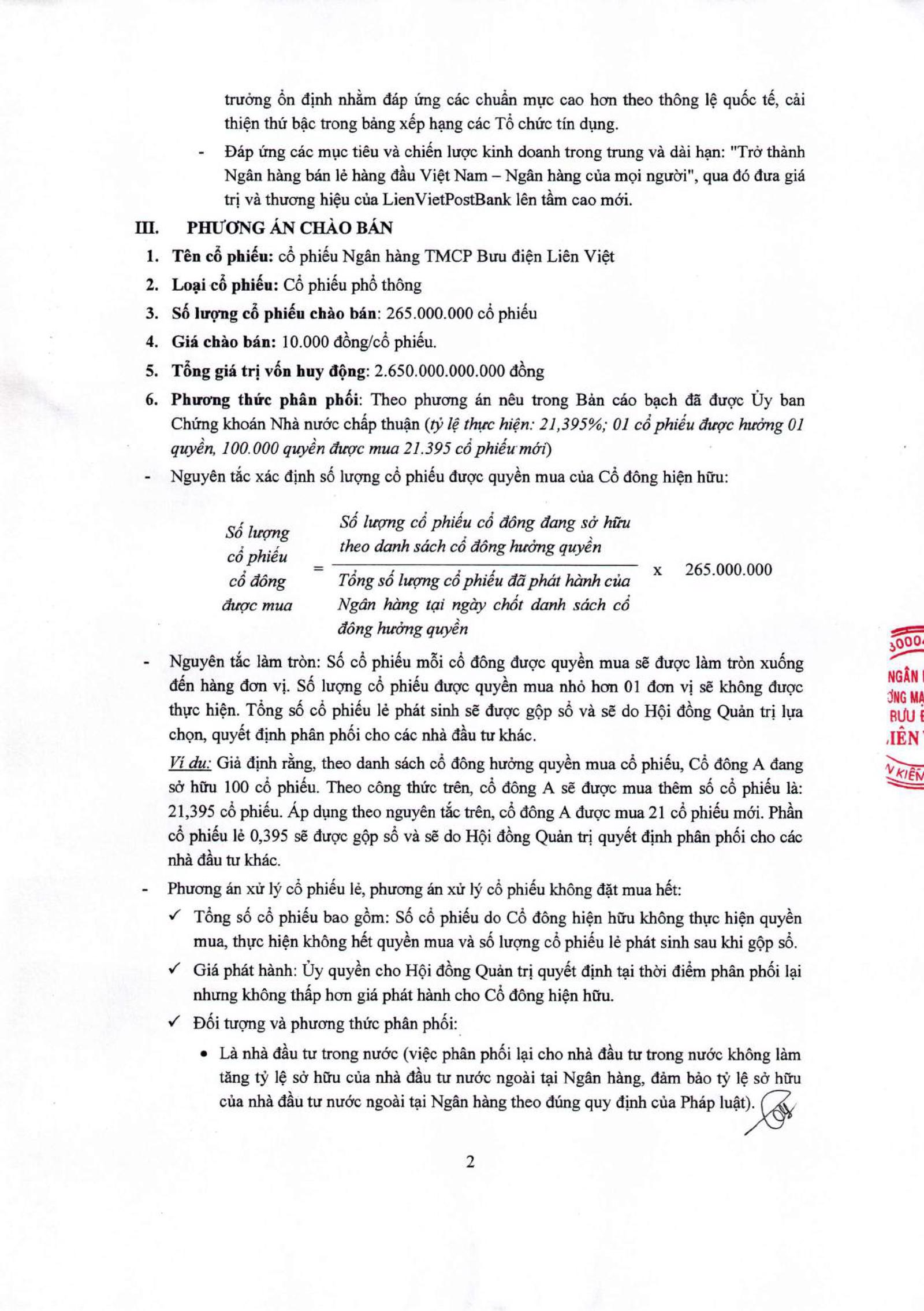 LienVietPostBank dự kiến phát hành 265 triệu cổ phiếu cho cổ đông hiện hữu. Tỷ lệ thực hiện quyền là 100 : 21,395; cổ đông sở hữu 1 cổ phiếu được hưởng 1 quyền mua, 100.000 quyền mua được mua thêm 21.395 cổ phiếu mới.