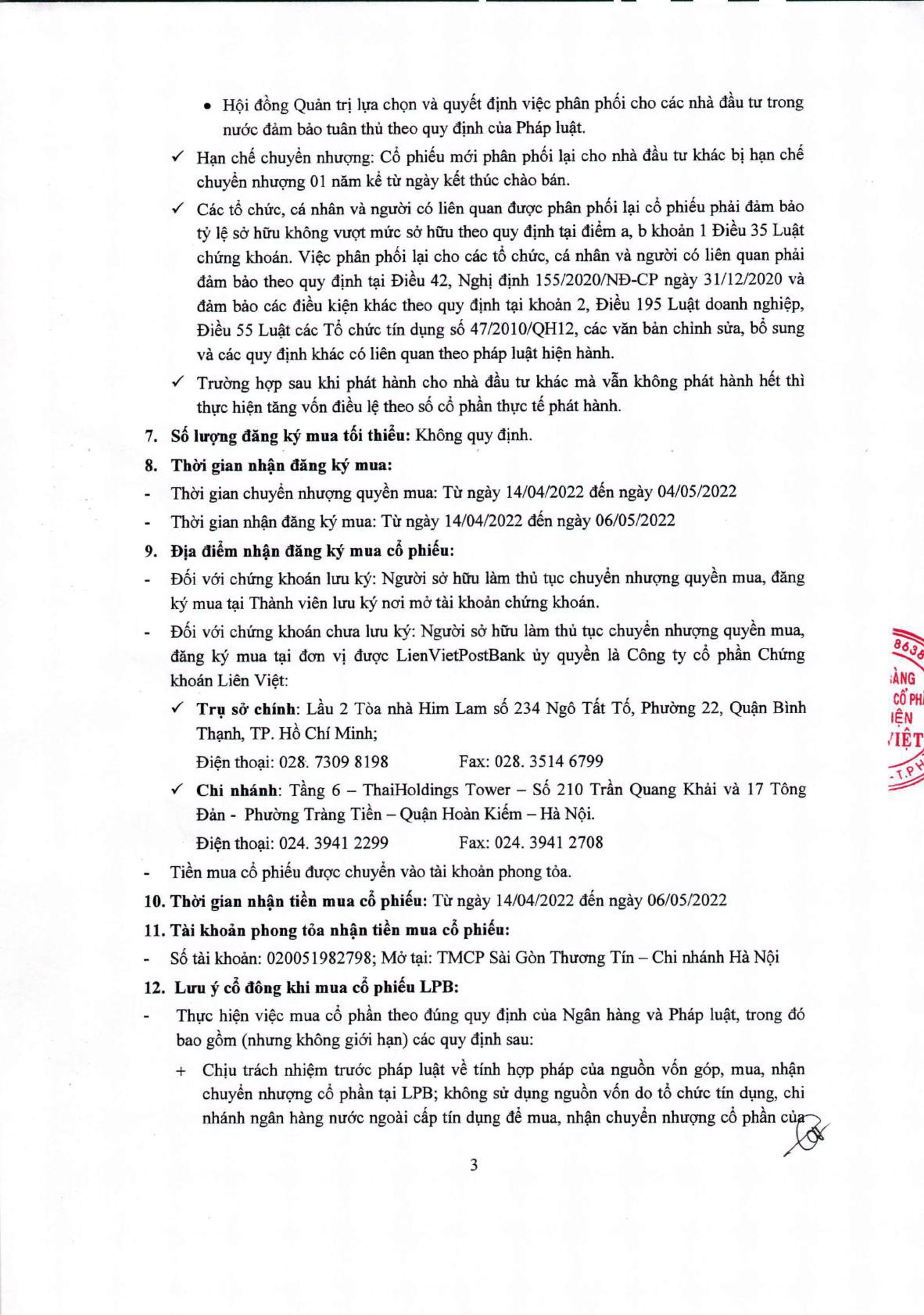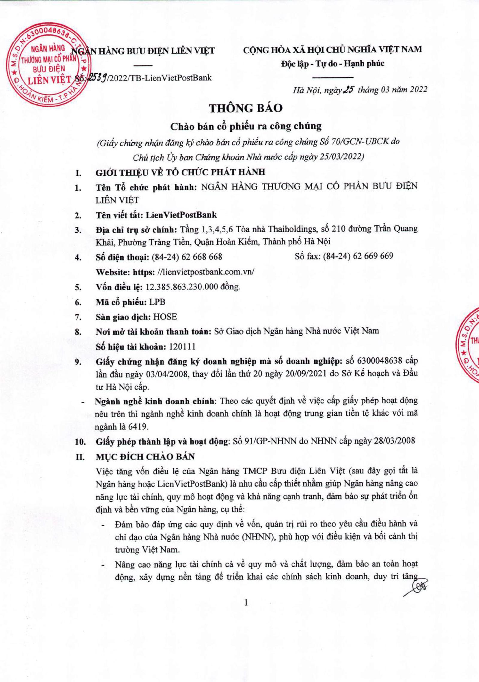 (Thanh tra) - Ngân hàng Bưu Điện Liên Việt (LienVietPostBank, HoSE: LPB) vừa có thông báo chào bán 265 triệu cổ phiếu ra công chúng, giá chào bán 10.000 đồng/1 cổ phiếu với tổng giá trị vốn huy động 2.650 tỷ đồng