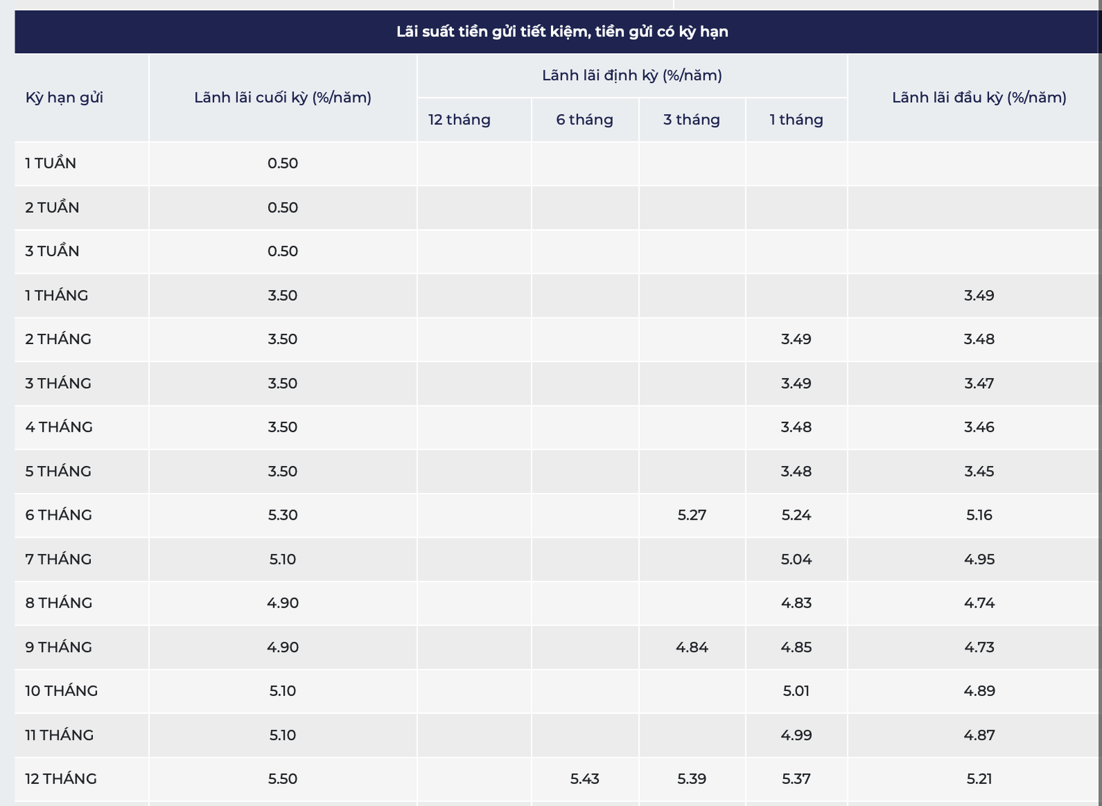 Cụ thể, lãi suất kỳ hạn 1 - 2 tháng hiện ở mức 3,95%/năm, kỳ hạn 3 - 5 tháng là 4,45%/năm. Ở nhóm kỳ hạn dài hơn, biểu lãi suất được niêm yết giảm theo từng mốc, gồm: 6 tháng còn 5,15%/năm; 7 tháng 5,25%/năm; 8 tháng 5,3%/năm; 9 tháng 5,35%/năm; 10 tháng 5,4%/năm; 11 tháng 5,45%/năm; 12 tháng 5,5%/năm và 15 tháng 5,75%/năm.