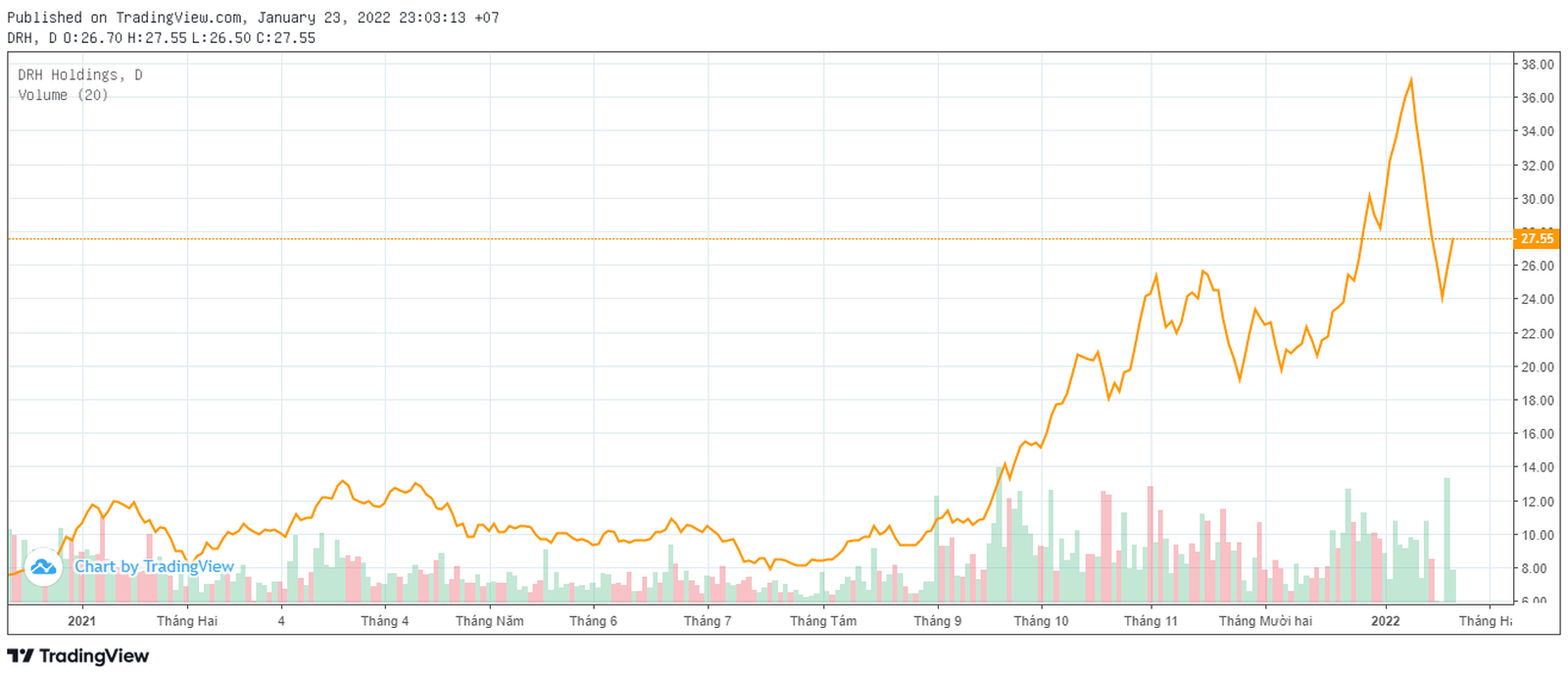 Cùng cơn sốt cổ phiếu bất động sản, DRH liên tục leo dốc và đạt đỉnh 5 năm ở mức 37.000 đồng/cổ phiếu vào ngày 11/1. Tuy nhiên, cổ phiếu này đã quay xe chóng vánh vùng đỉnh khi liên tiếp nằm sàn 6 phiên và rơi xuống vùng giá 24.000 đồng/cổ phiếu trước khi tăng trở lại trong 2 phiên gần đây.