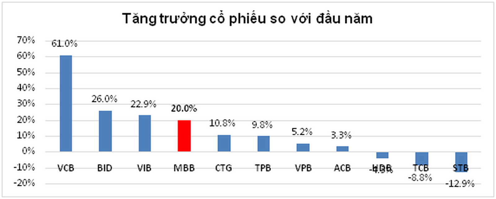 Tính đến 27/11, giá cổ phiếu MBB đã tăng 20% so với đầu năm 2019 và là một trong những cổ phiếu của ngân hàng lớn tăng mạnh nhất từ đầu năm đến nay. Về mặt định giá, theo số liệu từ Bloomberg.com, cổ phiếu MBB đang giao dịch ở mức PE và PB lần lượt là 6,7 lần và 1,3 lần, tương đối thấp so với định giá mặt bằng chung của ngành ngân hàng.