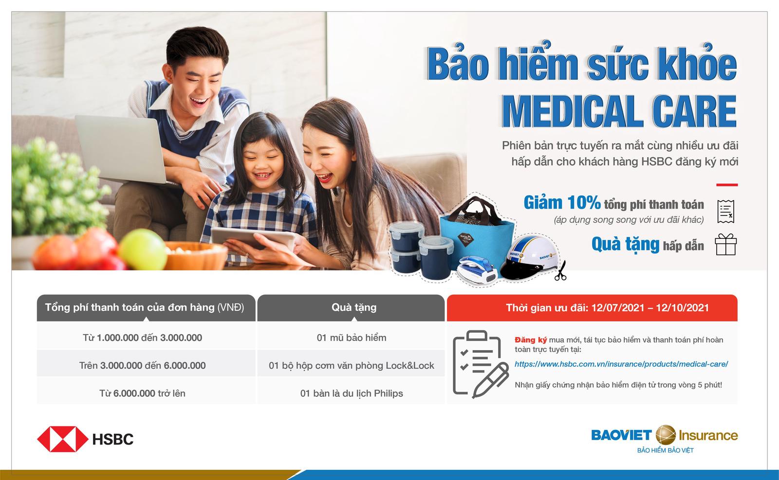 Trước đó, Tổng Công ty Bảo hiểm Bảo Việt và Ngân hàng TNHH một thành viên HSBC cũng chính thức giới thiệu phiên bản trực tuyến của chương trình bảo hiểm Medical Care trên website của Ngân hàng với nhiều ưu đãi hấp dẫn dành cho khách hàng. Phiên bản trực tuyến của bảo hiểm Medical Care ra mắt lần này hứa hẹn mang đến những trải nghiệm thuận tiện và mới mẻ nhất cho khách hàng khi vừa có thể đăng ký tham gia mới, tái tục bảo hiểm và thanh toán phí hoàn toàn trực tuyến, giấy chứng nhận bảo hiểm điện tử sẽ được gửi qua email trong vòng chưa đầy 5 phút. Chương trình có nhiều ưu điểm nổi bật như tích hợp miễn phí bảo hiểm cho bệnh ung thư, cung cấp tới 5 quyền lợi bổ sung giúp khách gia tăng nhu cầu bảo vệ tối đa, với quyền lợi bảo hiểm cơ bản lên đến 3 tỷ đồng.