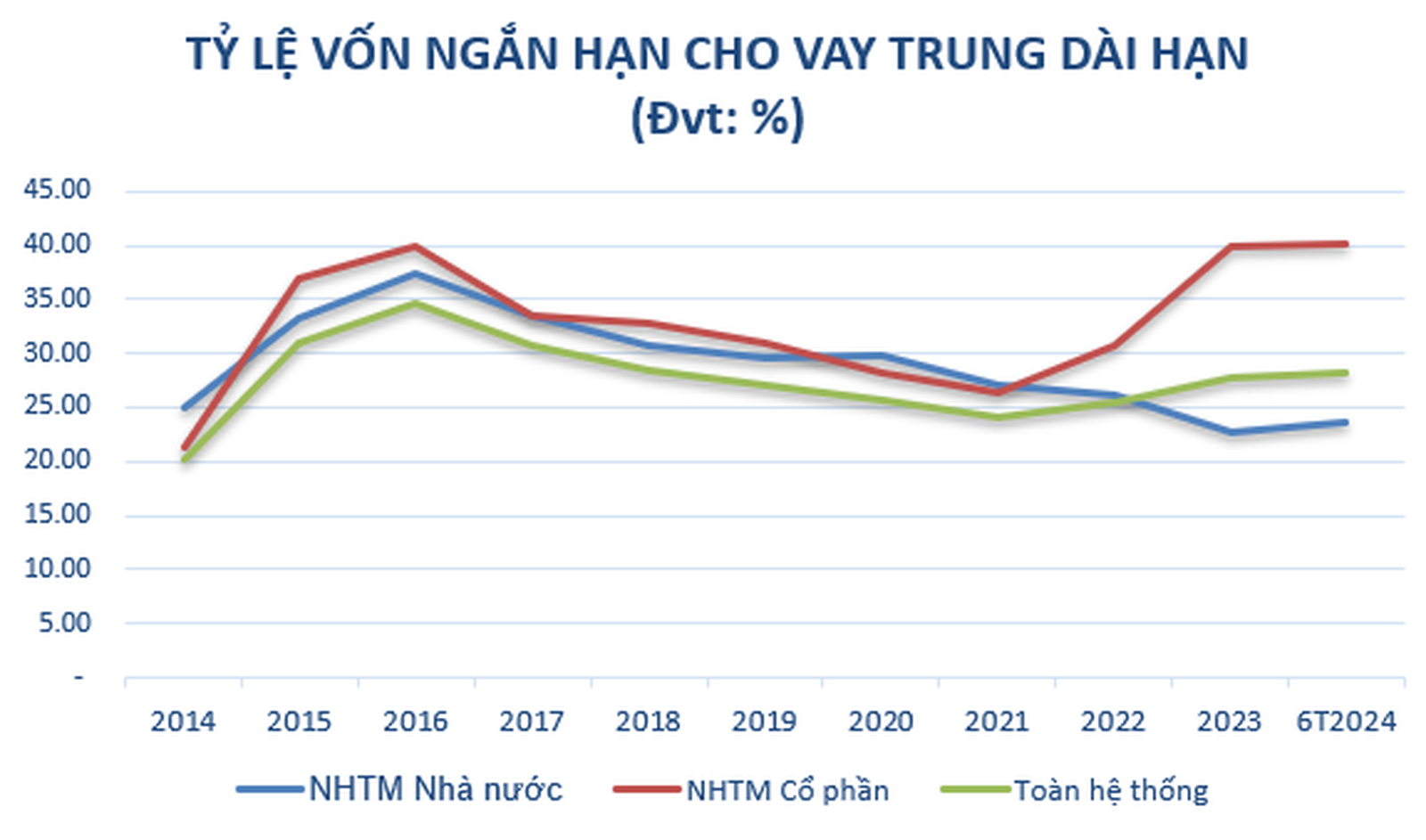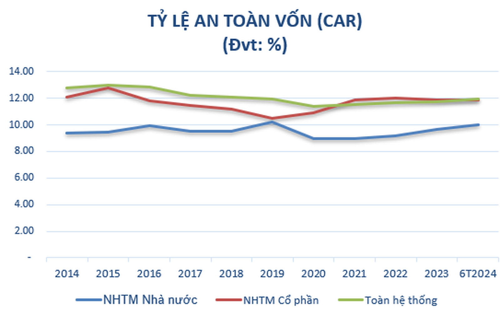 Sau 10 năm, tốc độ tăng trưởng vốn điều lệ cao, dẫn đến hệ số CAR của nhóm NHTM tư nhân cao hơn nhiều so với nhóm NHTM Nhà nước. Cụ thể, năm 2014, mức tỷ lệ an toàn vốn tối thiểu của nhóm NHTM Nhà nước là 9,4%, nhóm NHTM tư nhân là 12,07%. Đến tháng 6/2024, tỷ lệ an toàn vốn của nhóm NHTM cổ phần (11,86%) cũng cao hơn nhóm NHTM Nhà nước (9,99%), áp dụng theo Thông tư 41/2016/TT-NHNN.