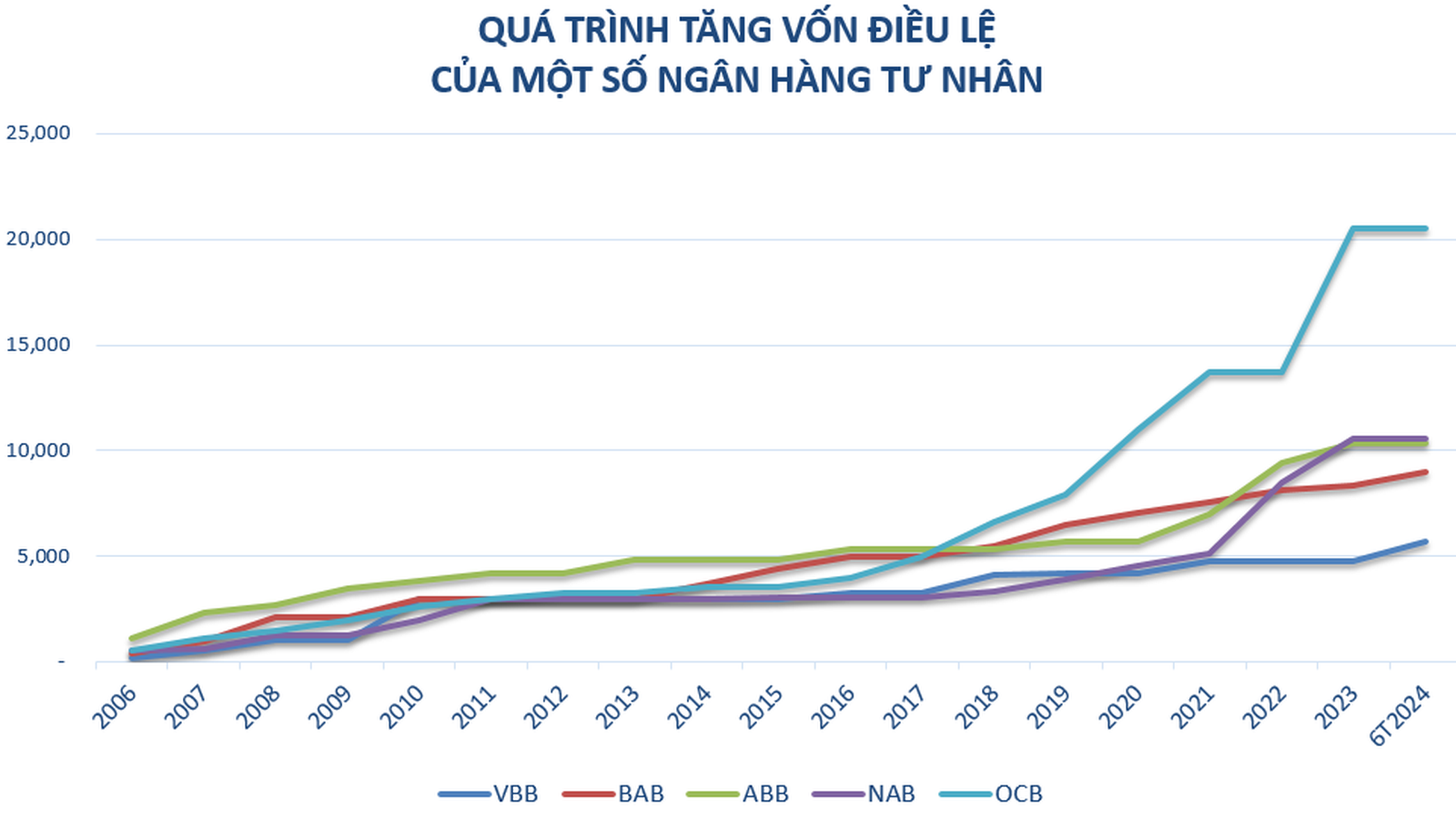 Những năm trở lại đây, các ngân hàng quy mô nhỏ và trung bình là nhóm ngân hàng chủ động tăng vốn điều lệ liên tục. Gia nhập đường đua tăng vốn trễ, nhưng tốc độ tăng trưởng lại nhanh hơn các ngân hàng khác sau 10 năm như OCB (5,8 lần), NamABank (3,5 lần), ABBank, BacABank và Vietbank tăng lên gấp đôi.