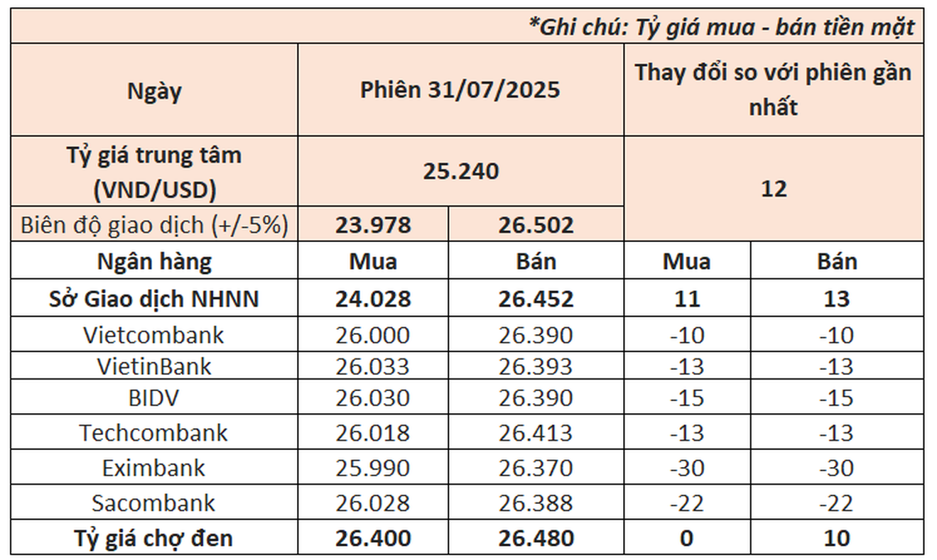 Trên thị trường liên ngân hàng, tỷ giá chốt phiên 30/7 ở mức 26.200 VND/USD, giảm 23 đồng so với phiên trước đó.