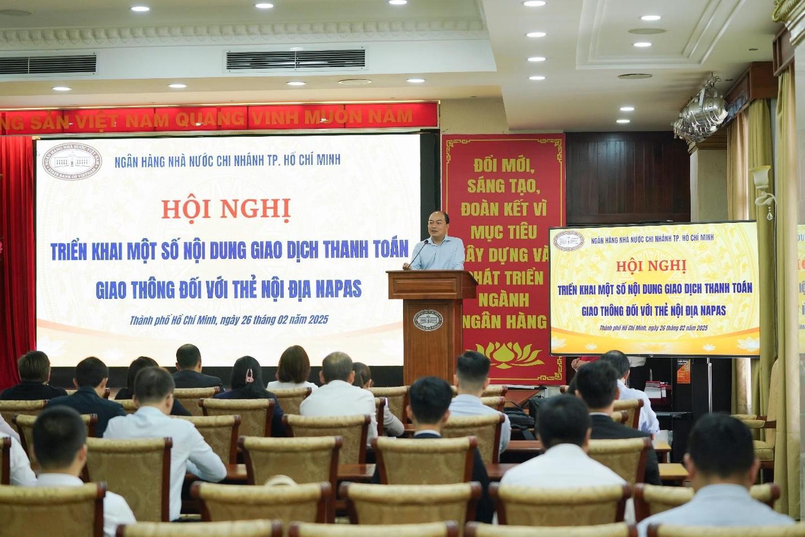 (Thanh tra) - Ngày 26/2, Ngân hàng Nhà nước chi nhánh TP. Hồ Chí Minh phối hợp cùng Công ty Cổ phần Thanh toán Quốc gia Việt Nam (NAPAS) và Công ty TNHH MTV Đường sắt đô thị số 1 TP. Hồ Chí Minh (HURC1) tổ chức “Hội nghị triển khai một số nội dung giao dịch thanh toán giao thông đối với thẻ nội địa NAPAS”. Sự kiện nhằm khuyến khích các ngân hàng và tổ chức thẻ tham gia mạng lưới thanh toán không dùng tiền mặt trong lĩnh vực giao thông công cộng, góp phần phát triển hệ sinh thái thanh toán hiện đại, tiện lợi cho người dân.
