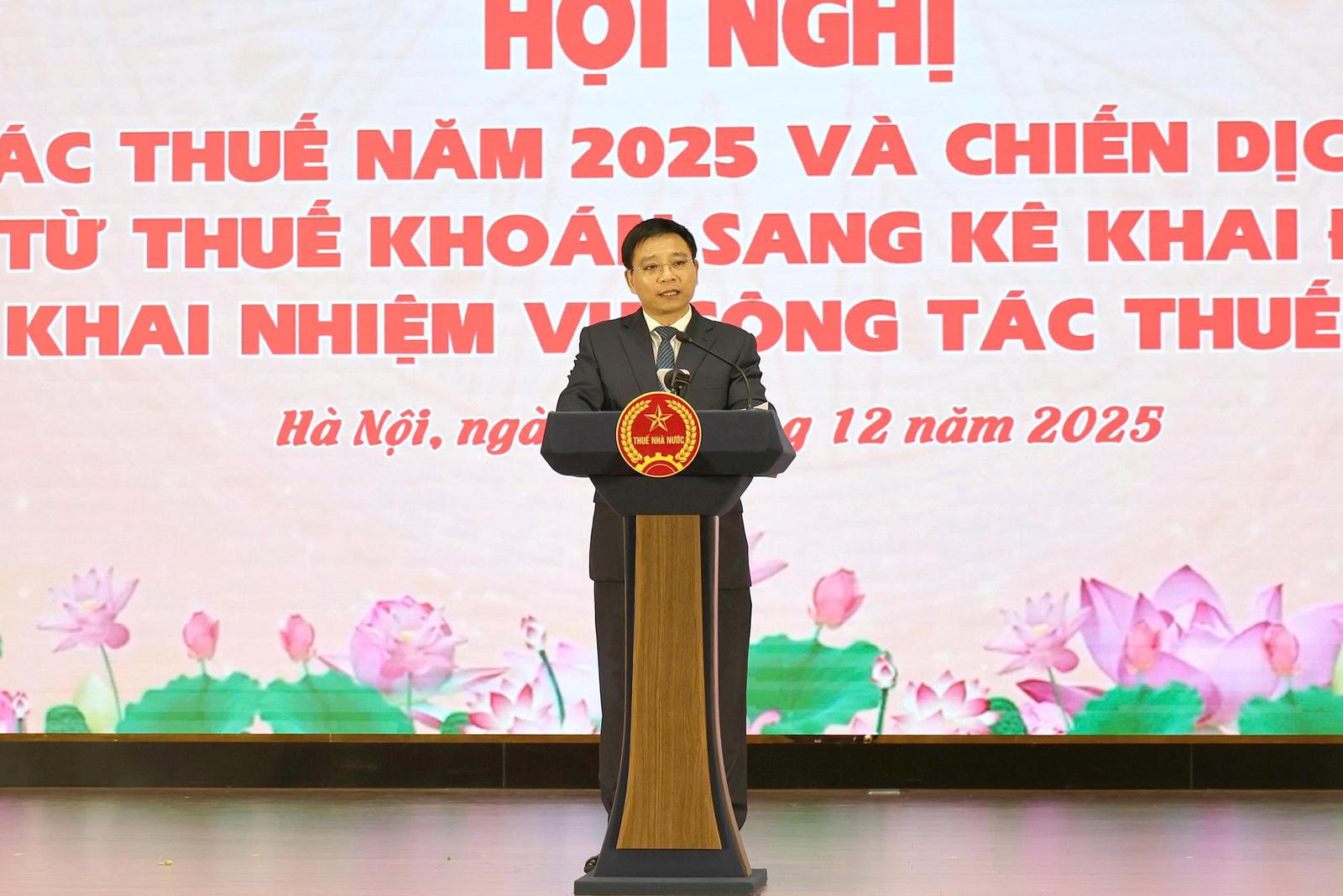Cục trưởng Cục Thuế Mai Xuân Thành phát biểu tại Hội nghị tổng kết công tác thuế năm 2025 và chiến dịch “60 ngày cao điểm chuyển đổi mô hình từ thuế khoán sang kê khai đối với hộ kinh doanh”; triển khai nhiệm vụ công tác thuế năm 2026. Ảnh: Cục Thuế