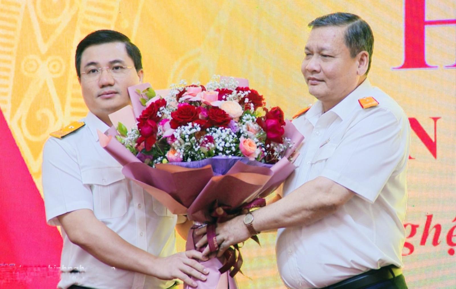 Phó Tổng cục trưởng Tổng cục Thuế Phi Vân Tuấn chúc mừng quyền Cục trưởng Cục Thuế tỉnh Nghệ An Nguyễn Đình Đức. Ảnh: NTV