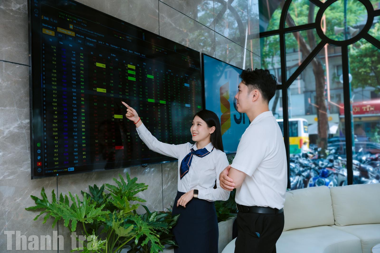Nhà đầu tư theo dõi bảng giá chứng khoán tại Công ty cổ phần chứng khoán Sài Gòn - Hà Nội (SHS). Ảnh: Bảo San