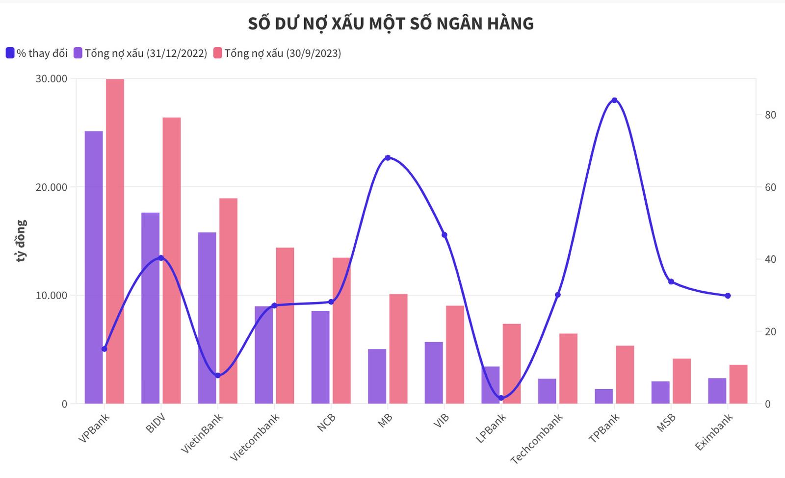 Tại nhóm ngân hàng tư nhân, các ngân hàng có nợ xấu tăng đến 3 chữ số như TPBank (tăng 294%), Sacombank (142%), LPBank (115%), MB (101%).