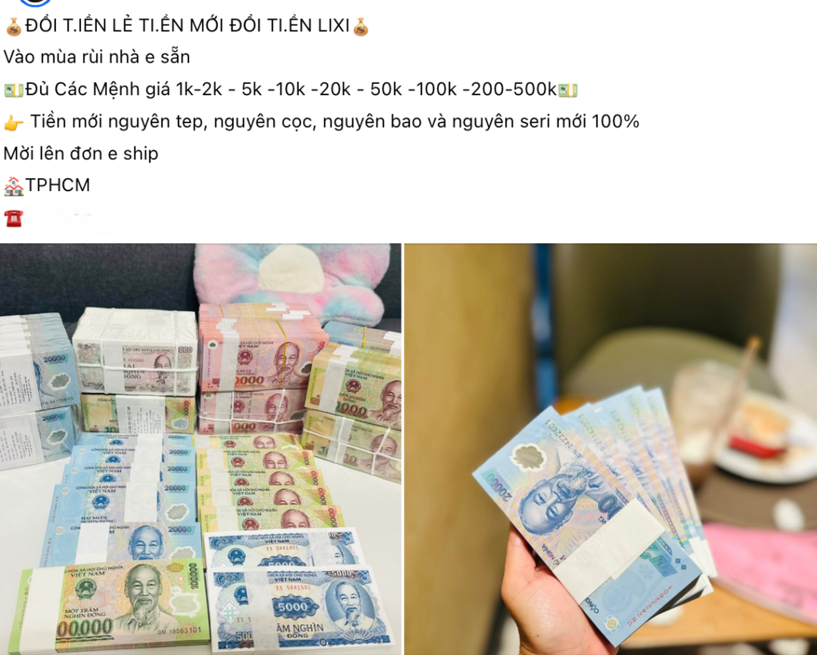 Dịch vụ đổi tiền mới, tiền lẻ dịp cận Tết Nguyên đán được quảng cáo công khai trên mạng xã hội, tiềm ẩn nhiều rủi ro cho người dân (Ảnh chụp màn hình).