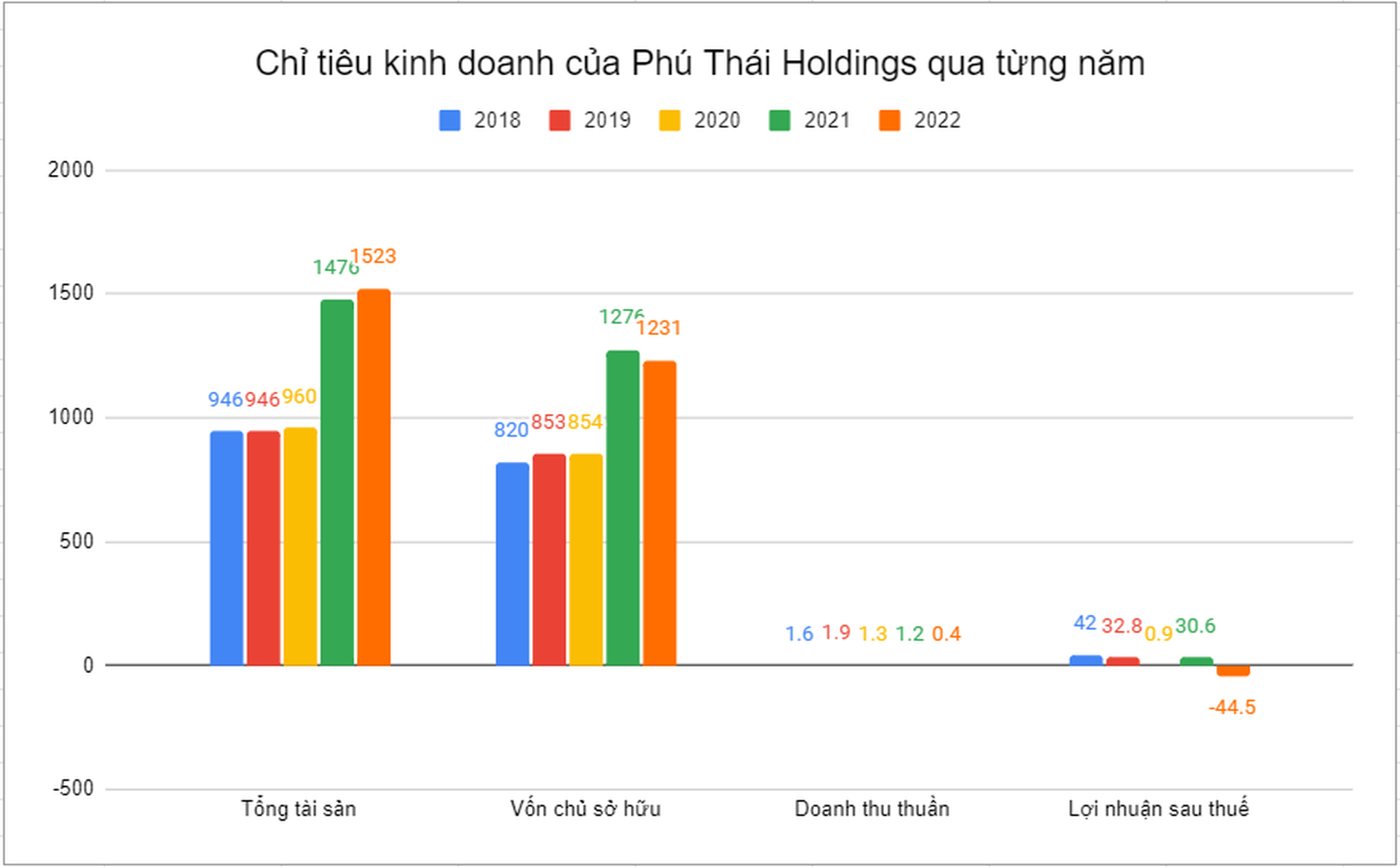 Tuy nhiên chỉ trong 2 năm từ 2021 - 2022, quy mô tài sản của Phú Thái Holdings đã có sự gia tăng đáng kể. Tổng tài sản tăng vọt lên 1.476 tỷ đồng tại năm 2021, rồi tiếp tục tăng lên 1.523 tỷ đồng tại năm 2022. Phần tăng chủ yếu đến từ việc tăng vốn chủ sở hữu, đạt 1.231 tỷ đồng tại năm 2022.