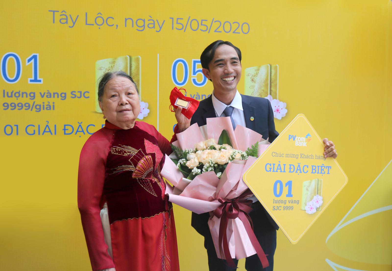 Theo đó, đại diện PVcomBank là ông Văn Đức Dũng – Giám đốc PVcomBank Tây Lộc đã trao Giải Đặc biệt - một lượng vàng SJC 9999 cho bà Thân Thị Cúc - khách hàng gửi tiền tiết kiệm tại PVcomBank Tây Lộc với sự tham gia chứng kiến của các khách hàng, cơ quan báo chí và truyền thông tại địa phương.