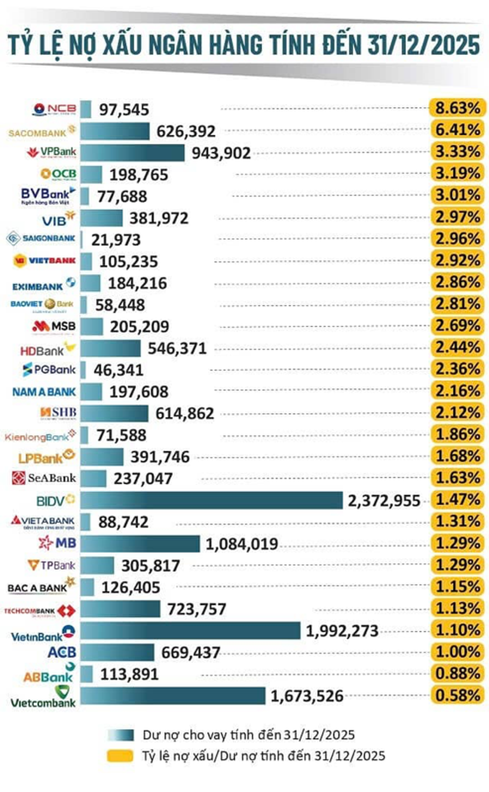 Theo số liệu, tỷ lệ nợ xấu nội bảng của hệ thống ngân hàng Việt Nam có xu hướng tăng nhanh từ năm 2022 - 2023 rồi dần ổn định trở lại vào cuối 2024 - 2025, song vẫn đang duy trì ở mức cao.