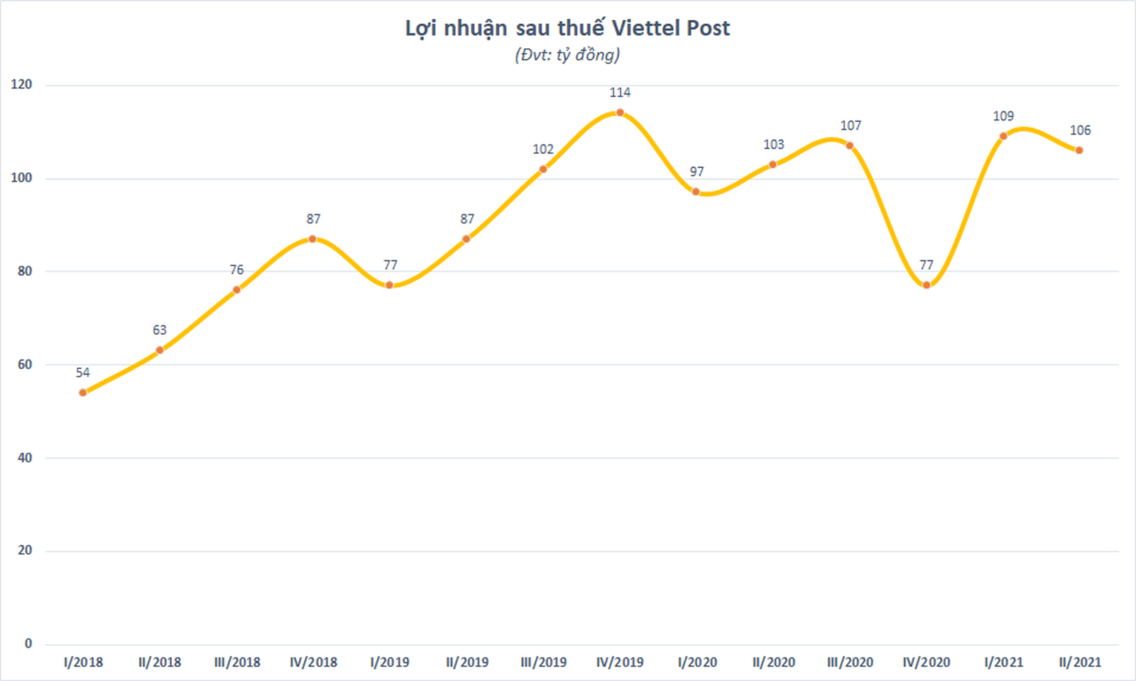 Lũy kế 6 tháng đầu năm 2021, Viettel Post ghi nhận 10.351 tỷ đồng doanh thu thuần và 268,5 tỷ đồng lợi nhuận trước thuế, lần lượt tăng 52% và 7% so với cùng kỳ năm trước. Lãi ròng thu về 214 tỷ đồng, cũng tăng 7,2% so với thực hiện trong nửa đầu năm ngoái.
