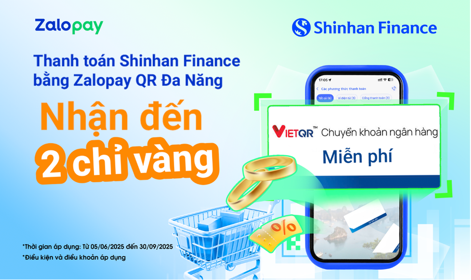 Đặc biệt, từ 05/06/2025 đến hết 30/09/2025, khi thực hiện giao dịch thanh toán khoản vay hoặc dư nợ thẻ tín dụng của Shinhan Finance bằng hình thức chuyển khoản ngân hàng qua VietQR trên iShinhan, khách hàng có mã giao dịch kết thúc bằng hai số cuối “66” sẽ có cơ hội nhận các phần quà hấp dẫn mỗi tháng: 0.5 chỉ vàng SJC (quy đổi mệnh giá tương đương 6.000.000đ) cho 01 khách hàng có giá trị thanh toán cao nhất và rất nhiều combo e-voucher Zalopay cho 09 khách hàng có giá trị giao dịch cao tiếp theo.