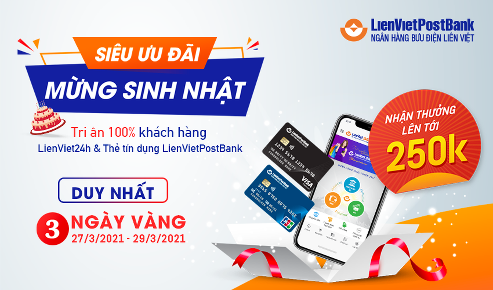 ( Thanh tra) - Nhân dịp kỉ niệm 13 năm thành lập, LienVietPostBank triển khai chương trình khuyến mại hấp dẫn “Siêu ưu đãi - Mừng sinh nhật” với 100% cơ hội nhận thưởng thay cho lời cảm ơn tới tất cả khách hàng đã tin tưởng và đồng hành trên chặng đường không ngừng phát triển mạnh mẽ, vững chắc của Ngân hàng.