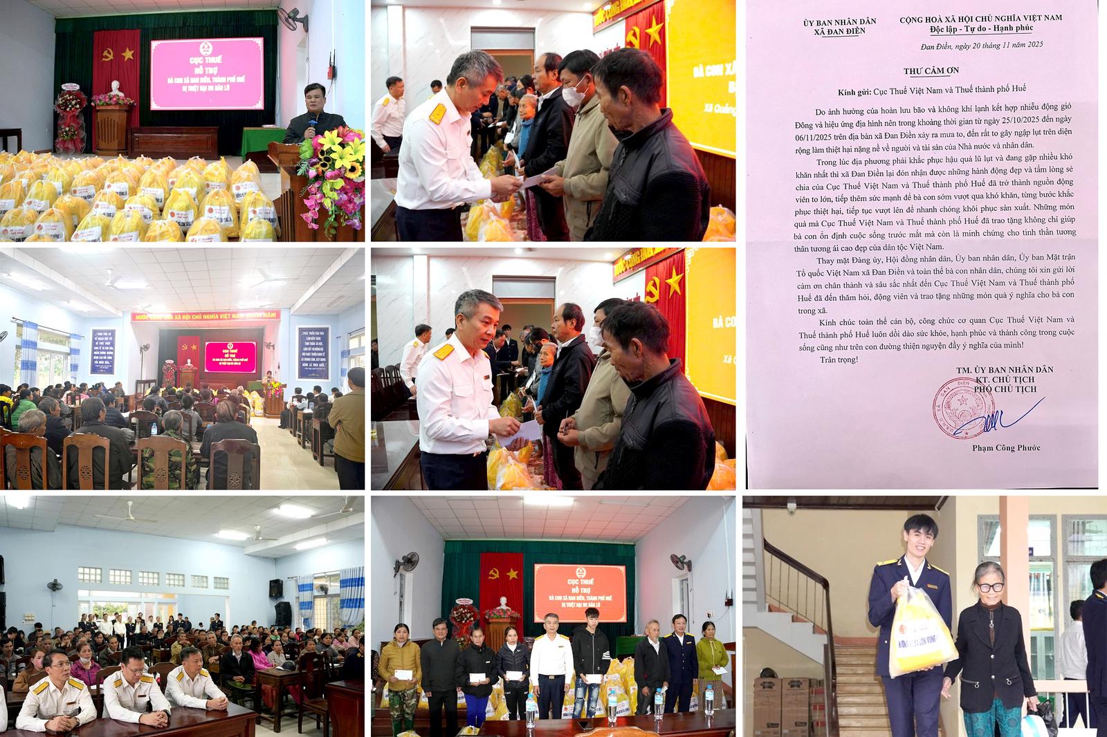 Trong khuôn khổ chuyến công tác, Đoàn đã đến thăm các hộ dân tại xã Đan Điền và xã Quảng Điền thuộc TP Huế. Với sự sẻ chia những tổn thất mà nhân dân gặp phải sau trận lũ lụt kéo dài vừa qua, Đoàn đã dành tặng 200 suất quà với tổng giá trị hỗ trợ 350 triệu đồng - là số tiền cán bộ, công chức cơ quan Cục Thuế quyên góp ủng hộ cho các hộ dân bị tổn thất nặng nề và trao hỗ trợ cho các gia đình công chức Thuế TP Huế bị thiệt hại nặng do lũ lụt.