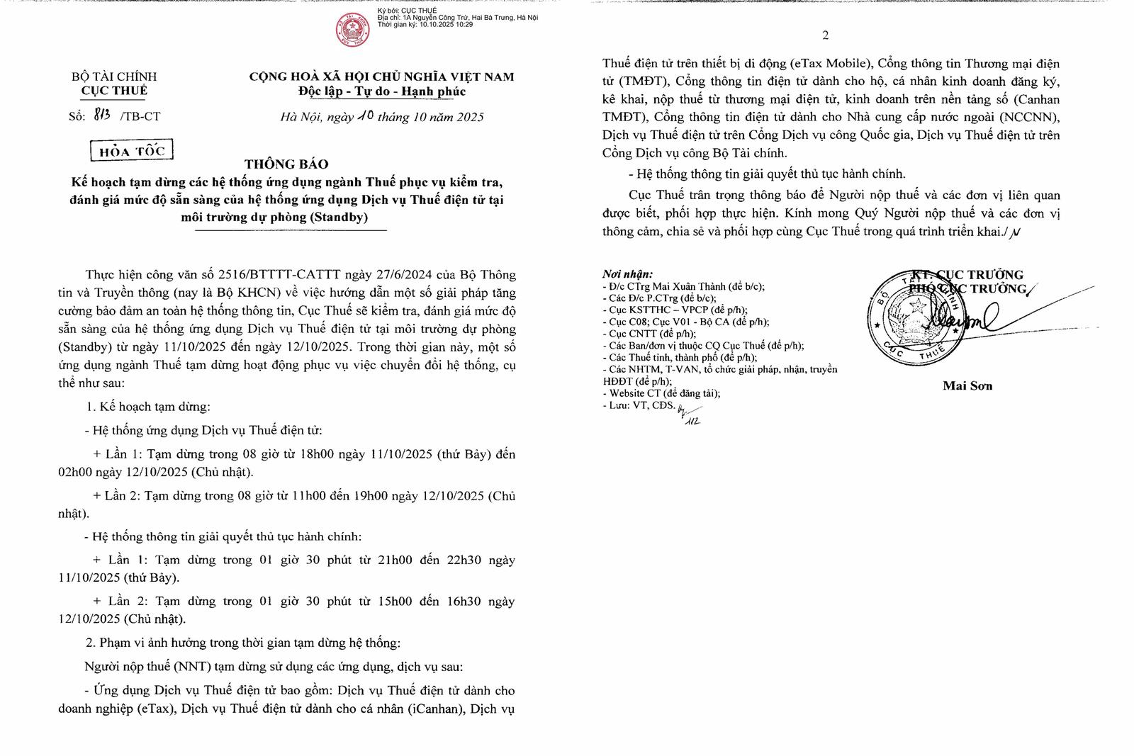 Ngày 10/10/2025, Cục Thuế phát đi 2 Thông báo số 812/TB-CT và 813/TB-CT gửi các cơ quan, đơn vị thuộc các bộ, ngành, người nộp thuế và cơ quan thuế các cấp để thông tin về kế hoạch tạm dừng các hệ thống ứng dụng ngành Thuế phục vụ kiểm tra, đánh giá mức độ sẵn sàng của hệ thống ứng dụng Dịch vụ Thuế điện tử tại môi trường dự phòng (Standby).