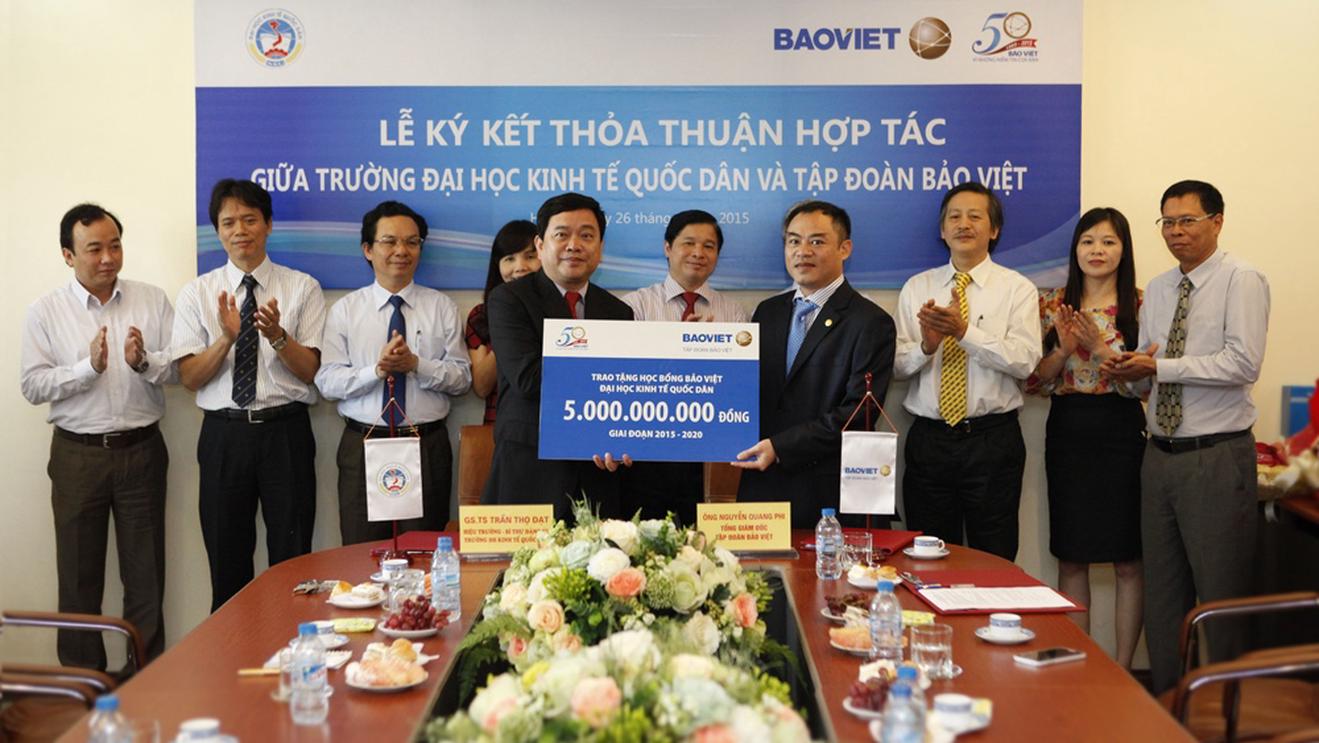 Trường ĐH KTQD là một trong những trường đại học hàng đầu cả nước với chất lượng các sinh viên ra trường được đánh giá cao. Chính vì vậy bắt đầu từ năm 2015, Bảo Việt sẽ cấp học bổng cho các em sinh viên có thành tích học tập xuất sắc, sinh viên nghèo vượt khó thuộc Trường ĐH KTQD. Dự kiến, thỏa thuận hợp tác sẽ kéo dài trong vòng 05 năm (2015-2020) với tổng giá trị học bổng tài trợ đối đa là 5 tỷ đồng nhằm khuyến khích tinh thần học tập và phấn đấu vươn lên của các em.