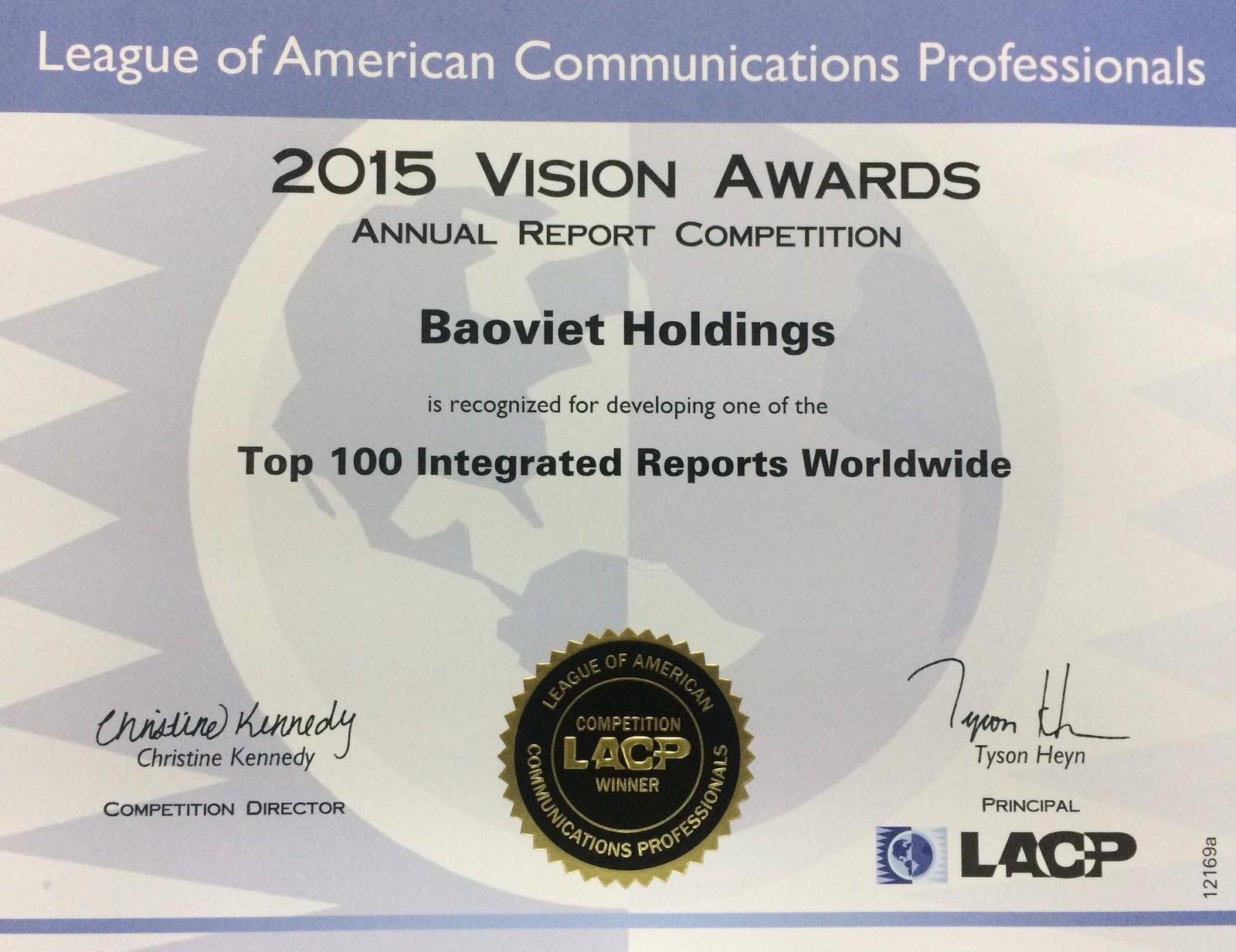 Bên cạnh đó, Bảo Việt cũng là doanh nghiệp duy nhất đại diện cho Việt Nam được Hiệp hội Truyền thông chuyên nghiệp Hoa Kỳ (LACP) vinh danh trong Top 100 báo cáo tích hợp xuất sắc trên thế giới và Top 11 Báo cáo tốt nhất khu vực Châu Á – Thái Bình Dương với 5 giải Bạch Kim (Platinum Awards), góp phần nâng tầm thương hiệu Việt trên thị trường quốc tế.