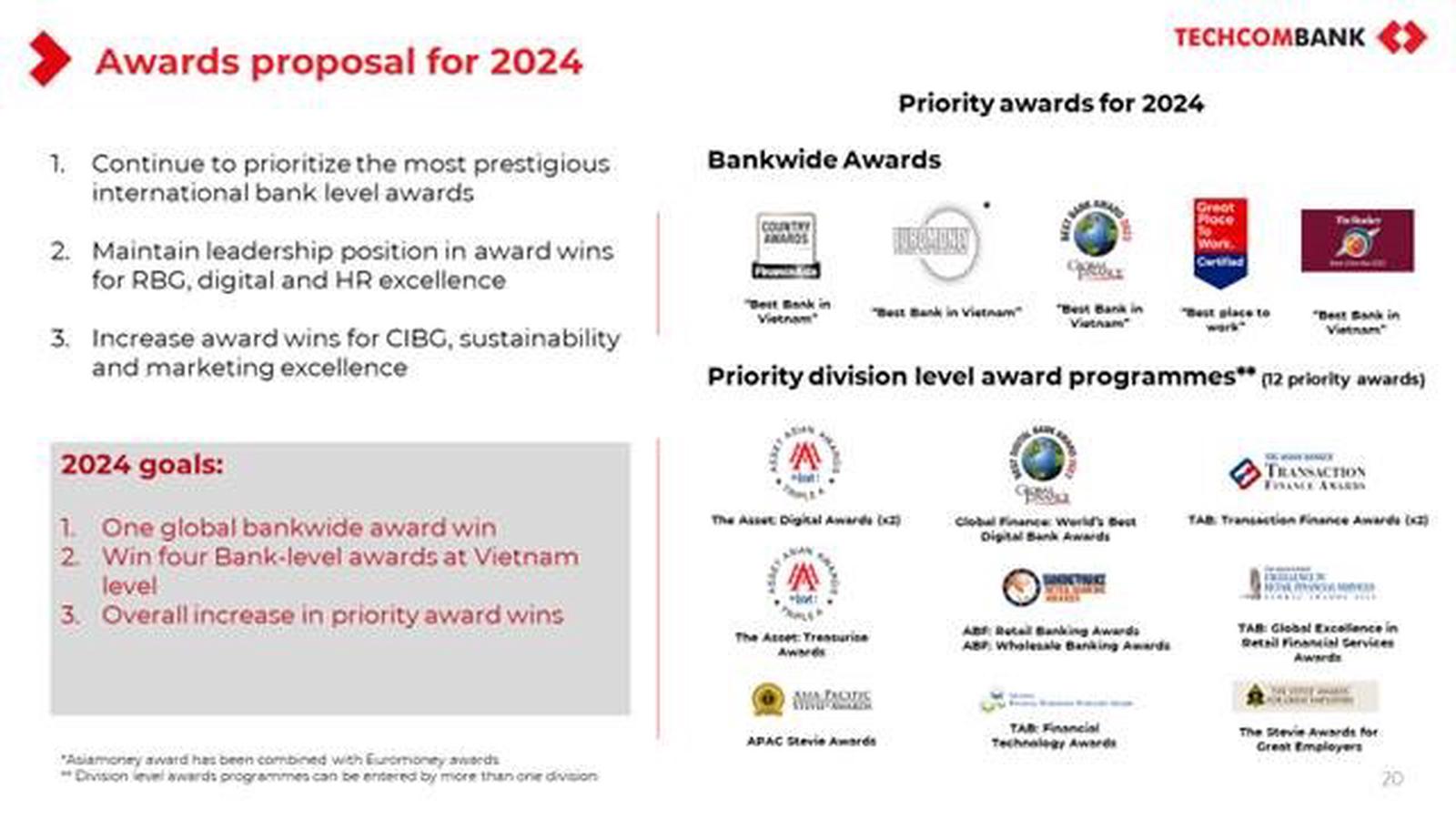Giải thưởng cũng ghi nhận những nỗ lực xuất sắc của Techcombank trong việc tuyển dụng và phát triển nhân tài giỏi nhất tại Việt Nam và quốc tế. Qua nhiều năm, Techcombank đã xây dựng được một trong những lực lượng lao động đa dạng nhất, lành nghề nhất và có mức độ gắn kết cao nhất trong ngành ngân hàng châu Á. Trong Khảo sát Gắn kết Nhân viên (Employee Engagement Survey – EES) năm 2023 của Techcombank, mức độ gắn kết của nhân viên ngân hàng đạt 82%. 87% các nhân viên cảm thấy được tạo điều kiện, và chỉ số hiệu quả đạt 77%. Những kết quả ấn tượng này đã đưa Techcombank lọt top 9% công ty hàng đầu ở khu vực Châu Á Thái Bình Dương về Hiệu quả Nhân viên và top 14% về Gắn kết và Tạo điều kiện cho Nhân viên. Điều này chứng tỏ Ngân hàng đang đi đúng hướng và đã thành công trong việc xây dựng nền tảng văn hóa tổ chức vững mạnh với những con người có năng lực, mức độ gắn kết cao, cùng chung giá trị, trung thành với tổ chức và dám bước ra khỏi vùng an toàn để phát triển bản thân.