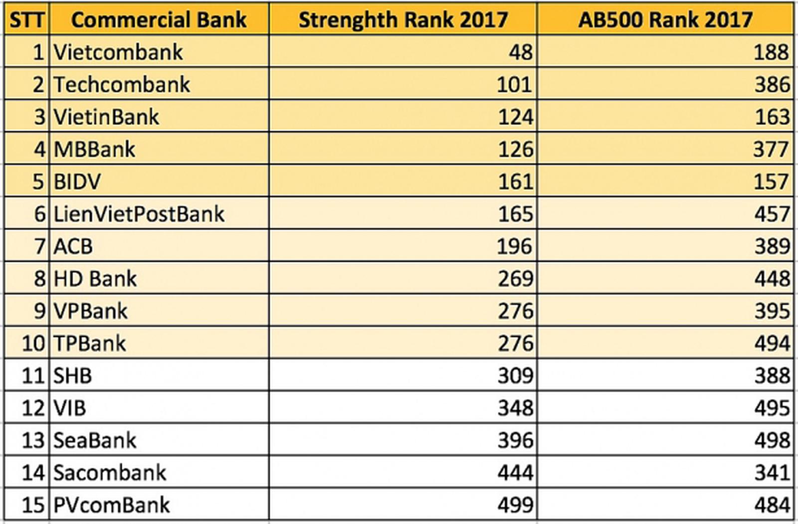 Bảng xếp hạng của 15 ngân hàng Việt Nam trong AB500 do The Asian Banker công bố