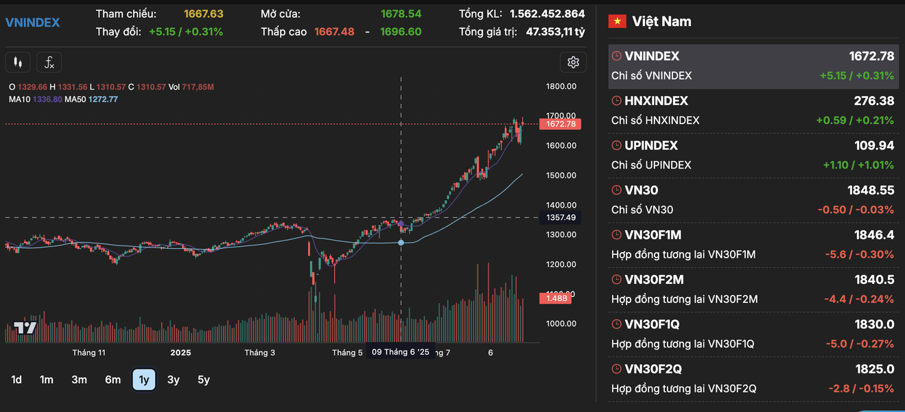 Tính đến ngày 21/7/2025, chỉ số VNIndex đạt 1.485,05 điểm, tăng 17,2% so với cuối năm 2024. Quy mô vốn hóa thị trường cổ phiếu 3 sàn HOSE, HNX và UPCOM đạt 8.214,67 nghìn tỉ đồng (328,5 tỉ USD), tương đương 71,4% GDP ước tính năm 2024.