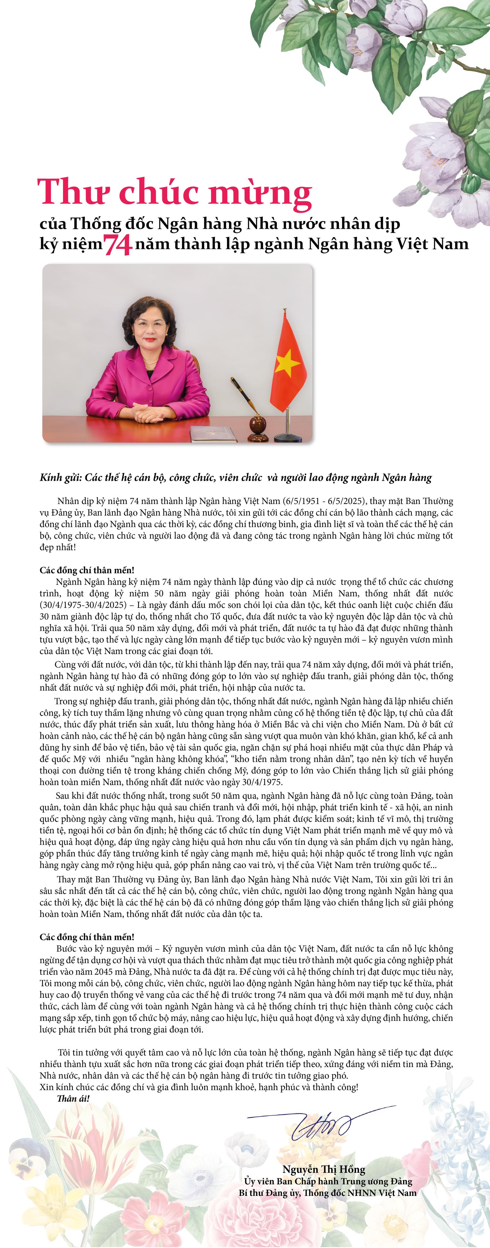 (Thanh tra) - Nhân dịp kỷ niệm 74 năm thành lập Ngân hàng Việt Nam (6/5/1951 - 6/5/2025), Thống đốc Ngân hàng Nhà nước (NHNN) Nguyễn Thị Hồng gửi thư chúc mừng tới các thế hệ cán bộ, công chức, viên chức và người lao động ngành Ngân hàng.