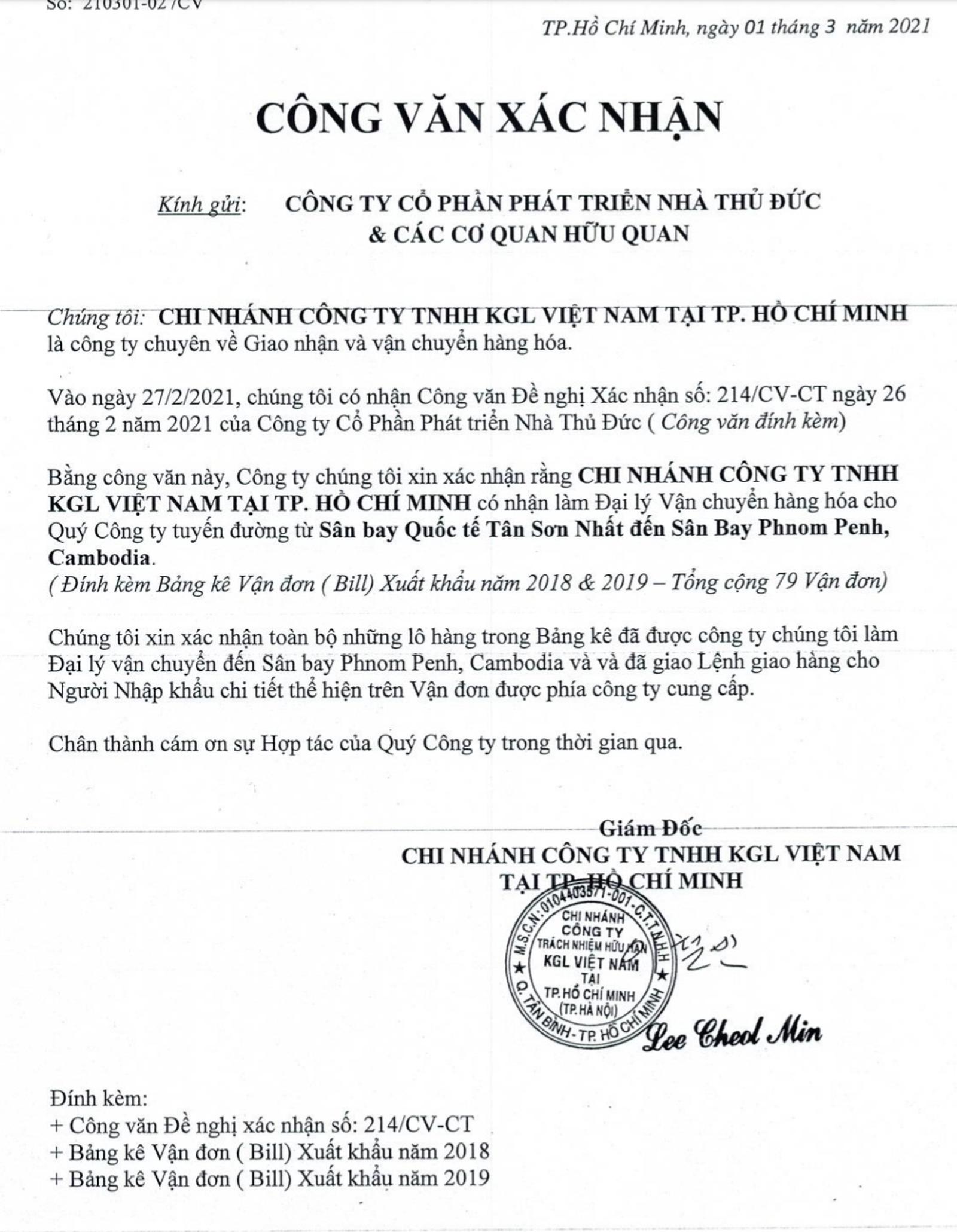 Liên quan đến nội dung được đề cập trong báo cáo của Tổng cục Hải quan Việt Nam, về xác nhận của Hải quan Hong Kong và Hải quan Campuchia, Thuduc House cho biết “03 lô hàng xuất khẩu của Công ty CP Phát triển Nhà Thủ Đức gồm 02 lô xuất cho đối tác DSPSG LOGISTICS CO,. LTD; 01 lô xuất cho đối tác ROTHADY IMPORT EXPORT CO, không được nhập khẩu vào Hong Kong” và “02 công ty MEAS CHANNY IMPORT EXPORT CO,. LTD; AKCHALNAK TROP ANTARAKCHEAT PLC chưa được đăng ký tại Tổng cục Thuế Campuchia, không có dữ liệu xuất nhập khẩu của các công ty này trong năm 2018, 2019”, Thuduc House nêu như sau: