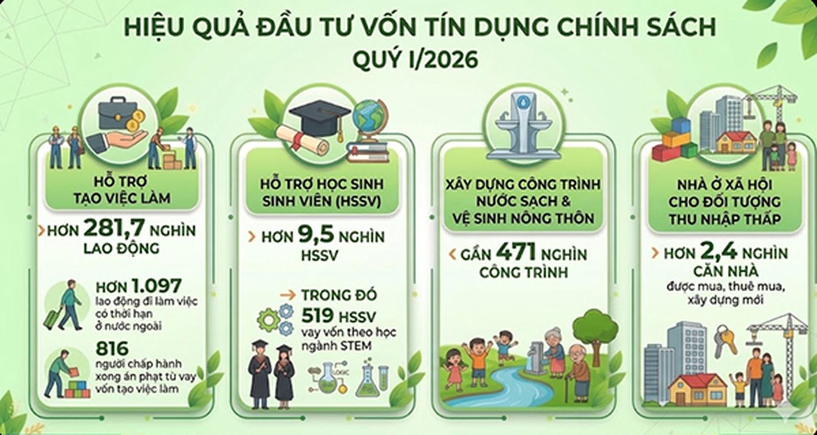 Vốn tín dụng chính sách đã hỗ trợ đầu tư sản xuất kinh doanh, tạo việc làm cho hơn 281,7 nghìn lao động, trong đó hơn 1.097 lao động đi làm việc có thời hạn ở nước ngoài và 816 người chấp hành xong án phạt tù vay vốn tạo việc làm; giúp hơn 9,5 nghìn học sinh, sinh viên có hoàn cảnh khó khăn vay vốn học tập, trong đó 519 HSSV vay vốn theo học ngành STEM; xây dựng gần 471 nghìn công trình nước sạch, công trình vệ sinh ở nông thôn; mua, thuê mua, xây dựng mới hơn 2,4 nghìn căn nhà ở xã hội cho các đối tượng thu nhập thấp…