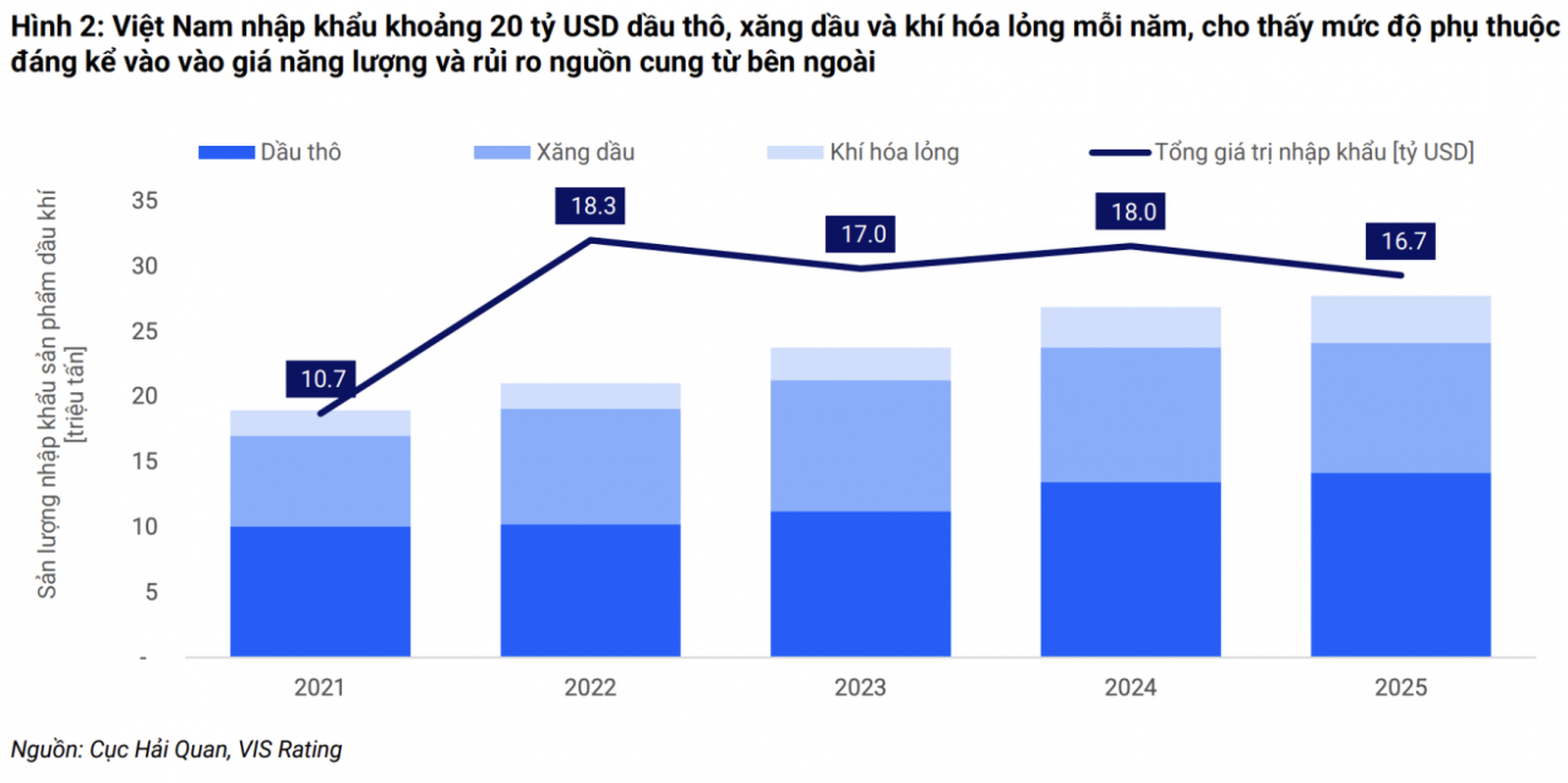 Hiện Việt Nam vẫn phụ thuộc đáng kể vào nguồn nhiên liệu nhập khẩu, với kim ngạch dầu thô, xăng dầu và các sản phẩm liên quan khoảng 20 tỷ USD mỗi năm. Đáng chú ý, cơ cấu nguồn cung có tỷ trọng lớn đến từ Trung Đông, chiếm khoảng 80% dầu thô và khoảng 15% khí hóa lỏng nhập khẩu. Sự phụ thuộc này khiến chuỗi cung ứng năng lượng trong nước nhạy cảm hơn trước các cú sốc giá từ thị trường quốc tế.