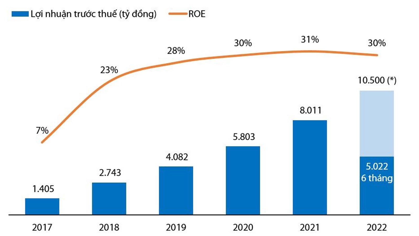 Nguồn: Báo cáo tài chính VIB. (*) Kế hoạch lợi nhuận trước thuế năm 2022. Lợi nhuận trước thuế và ROE của VIB giai đoạn 2017 – 2022