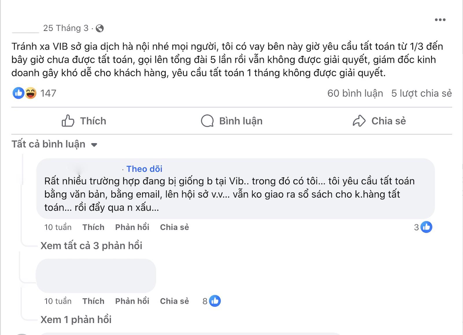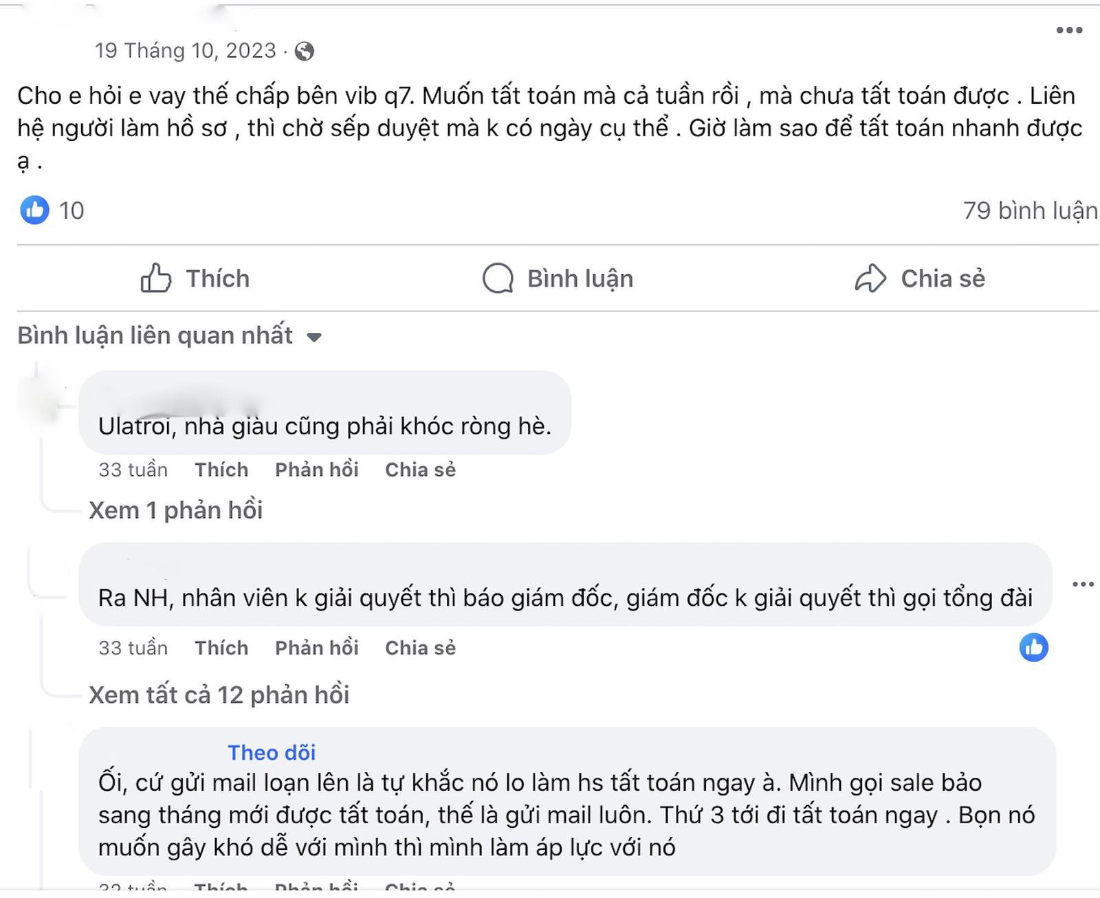 Khách hàng phản ánh gặp khó khi muốn tất toán khoản vay tại VIB trên một group về ngân hàng. Ảnh: Chụp màn hình
