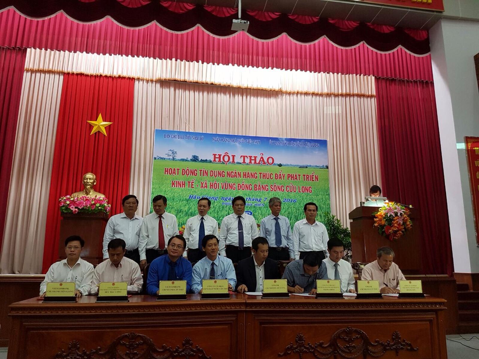 Đại diện chi nhánh Vietcombank Tiền Giang (hàng đầu, ngoài cùng bên trái) và chi nhánh Vietcombank Cần Thơ (hàng đầu, thứ 3 từ trái sang) tham gia ký kết các hợp đồng tín dụng tại MDEC - Hậu Giang 2016