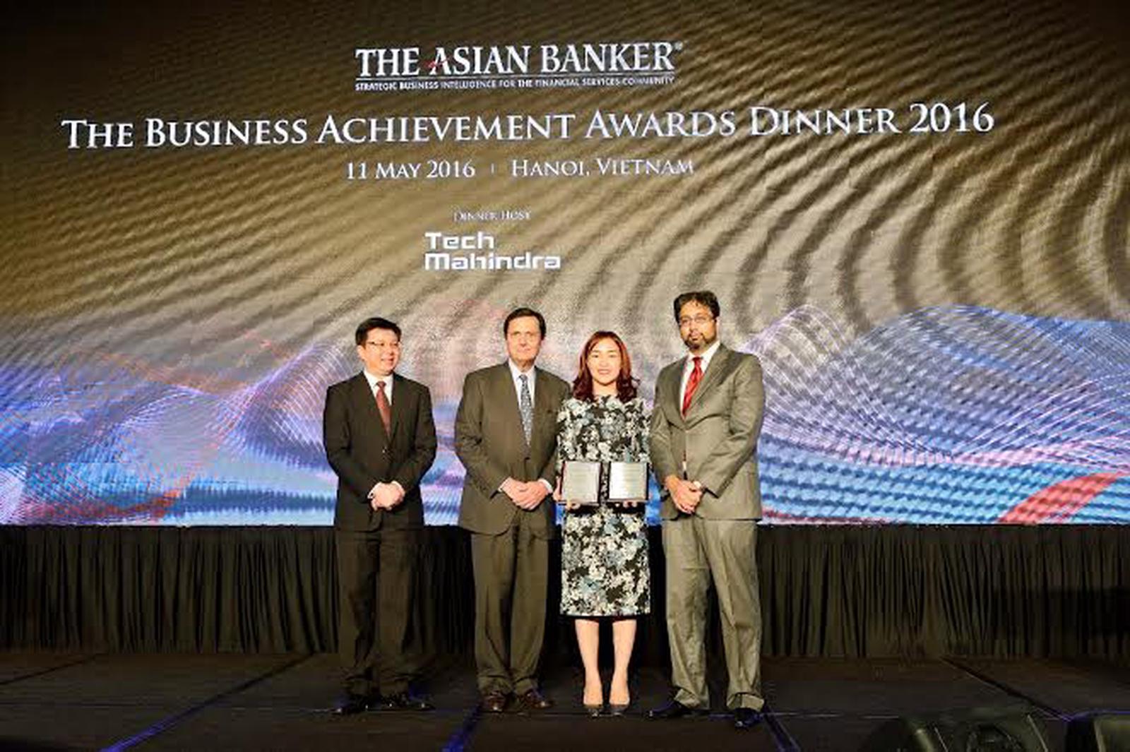 Đại diện Vietcombank, ông Huỳnh Song Hào - Giám đốc Khối Bán lẻ (thứ 2 từ phải sang) nhận giải thưởng "Ngân hàng cung cấp sản phẩm thẻ tín dụng tốt nhất Việt Nam" do Tạp chí The Asian Banker trao tặng