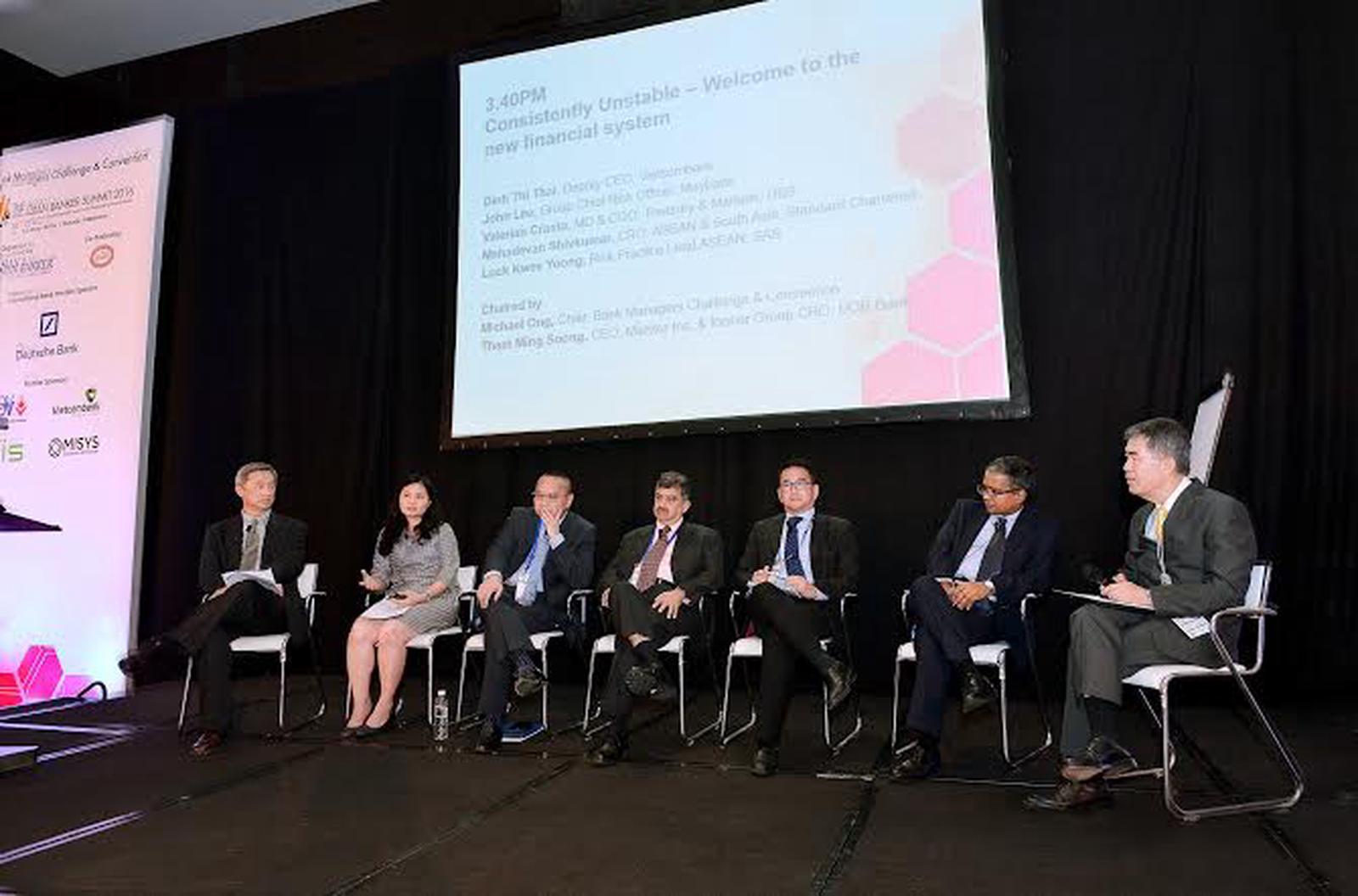 Bà Đinh Thị Thái - Phó Tổng Giám đốc Vietcombank (thứ 2 từ trái sang) tham gia tham luận tại “Hội thảo về các thách thức dành cho nhà lãnh đạo ngân hàng” trong khuôn khổ The Asian Banker Summit 2016