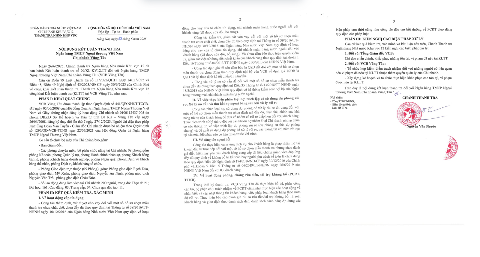 Nội dung kết luận thanh tra tại Vietcombank Vũng Tàu. Ảnh: TH