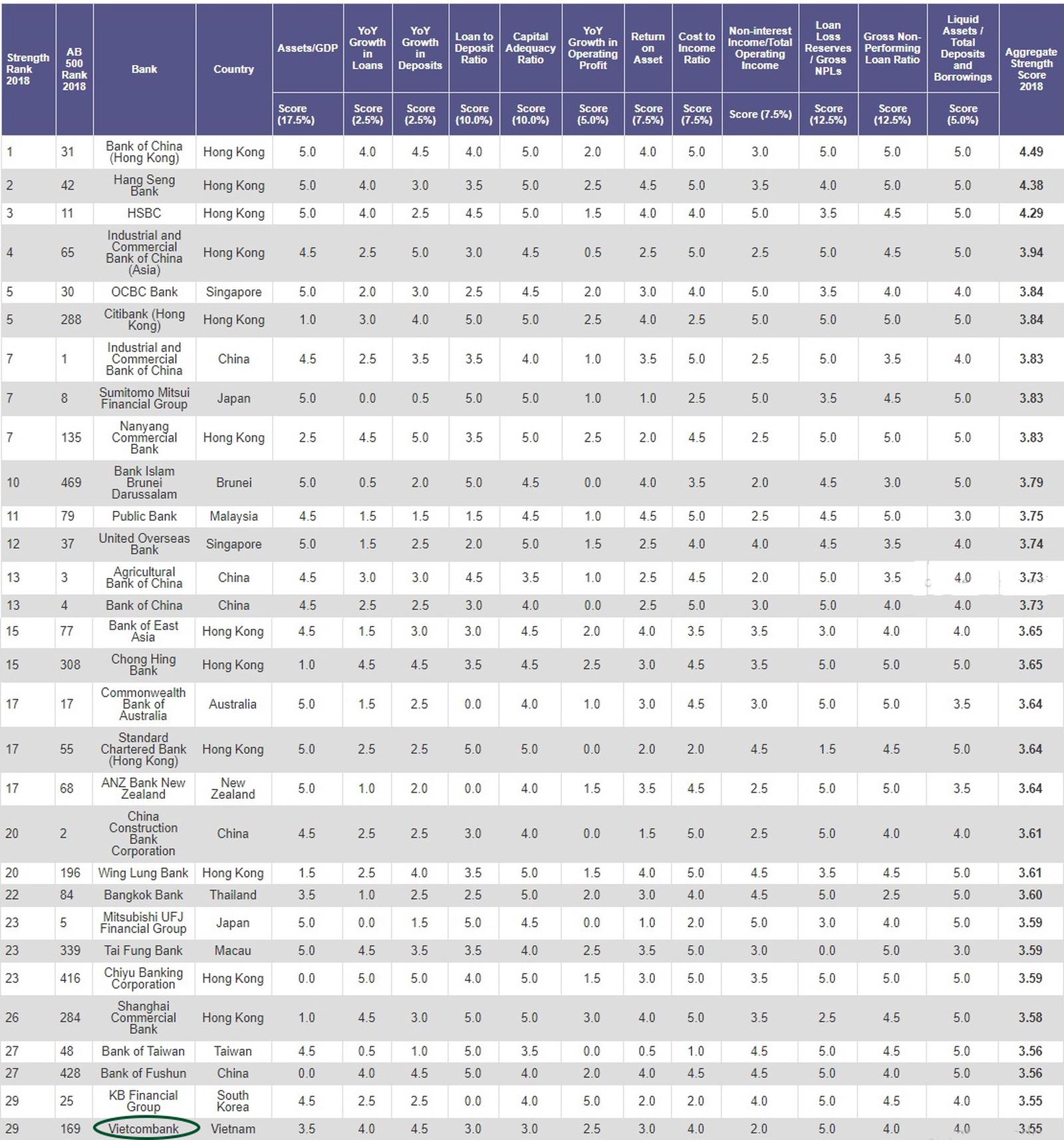 Xét về Strength Rank, Vietcombank vẫn là ngân hàng đứng đầu trong số 14 ngân hàng Việt Nam lọt top 500 và xếp thứ 29, tăng 19 bậc so với xếp hạng năm 2017.