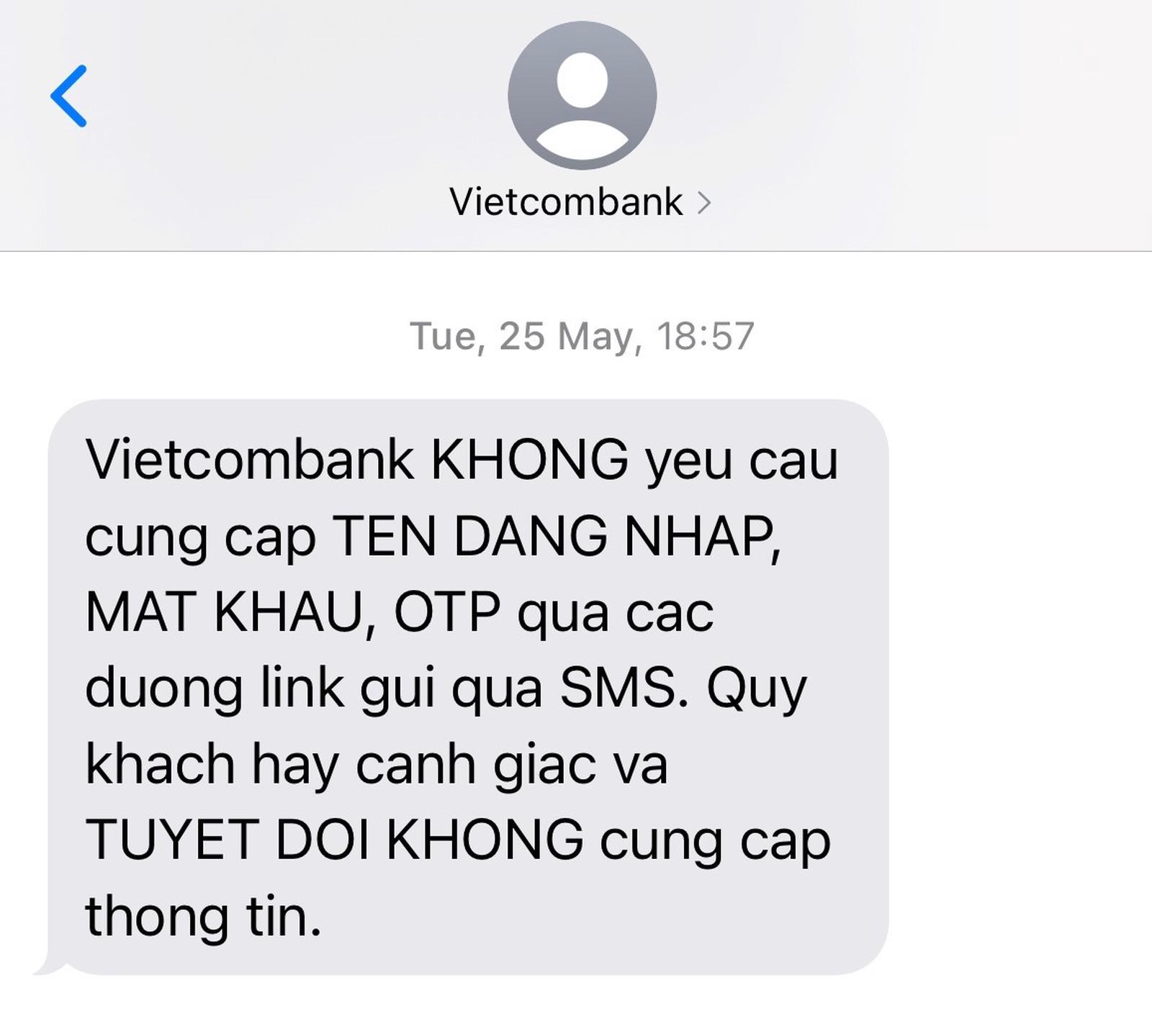 Vietcombank khẳng định không bao giờ liên hệ với khách hàng để yêu cầu cung cấp thông tin bảo mật dịch vụ dưới mọi hình thức. Vì vậy, các yêu cầu cung cấp thông tin định danh, mật khẩu, mã xác thực OTP (nếu có) đều là giả mạo, khách hàng tuyệt đối không cung cấp thông tin khi nhận được các yêu cầu này.