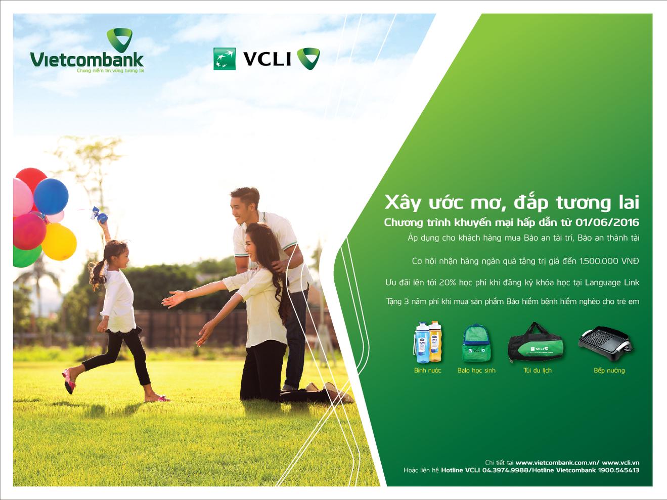 Nhân dịp ra mắt sản phẩm mới Bảo an tài trí, Ngân hàng Vietcombank phối hợp Công ty VCLI triển khai chương trình ưu đãi “Xây ước mơ, Đắp tương lai” từ 01/06/2016. Khách hàng khi tham gia sản phẩm Bảo an tài trí hoặc Bảo an thành tài sẽ có cơ hội nhận hàng ngàn quà tặng hấp dẫn trị giá lên đến 1,500,000 vnđ; đồng thời hưởng ưu đãi lên tới 20% học phí khi đăng ký khóa học tại Trung tâm Anh ngữ Language Link; và được tặng 3 năm phí hợp đồng khi mua sản phẩm bổ trợ Bảo hiểm bệnh hiểm nghèo cho trẻ em.