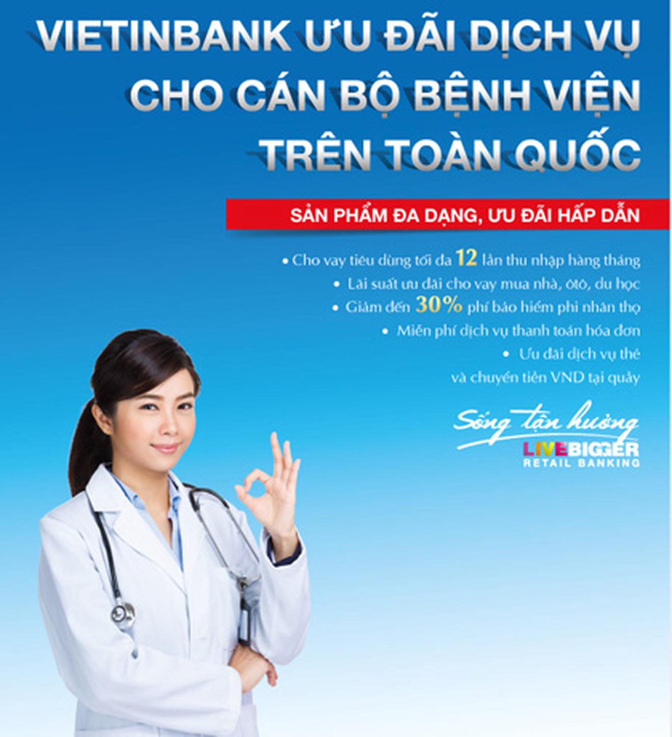 Từ nay đến 31/12/2016, VietinBank triển khai Chương trình ưu đãi lớn cho cán bộ, nhân viên (CBNV) đang công tác tại các bệnh viện trên toàn quốc như cho vay tiêu dùng ưu đãi lãi suất, miễn phí dịch vụ thẻ, giảm giá sản phẩm bảo hiểm…
