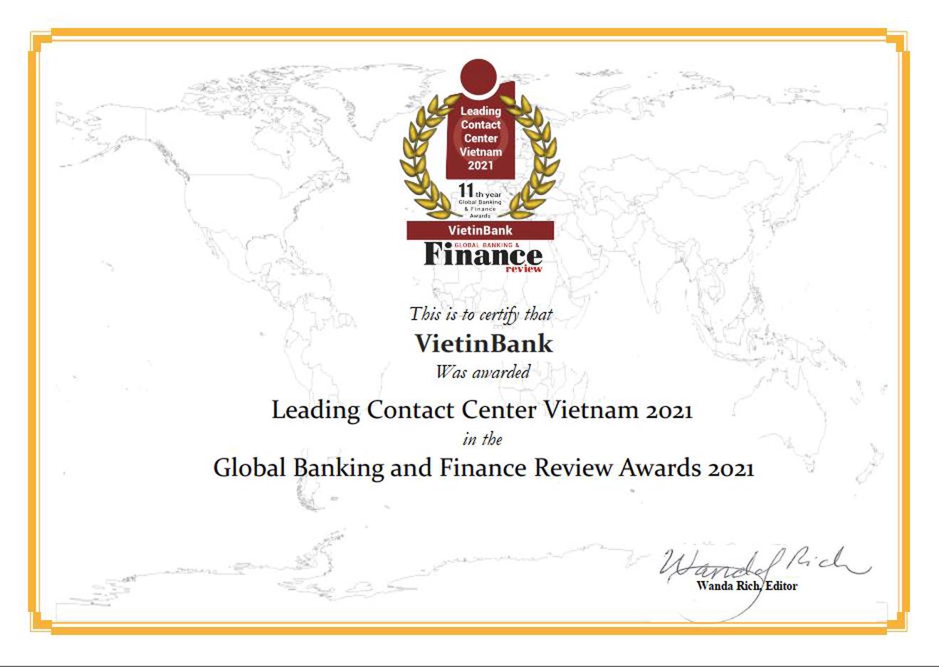Mới đây, VietinBank đã vinh dự được Tạp chí tài chính Global Banking & Finance Review (GBAF - Vương quốc Anh) trao tặng Giải thưởng Trung tâm Dịch vụ khách hàng (TTDVKH) dẫn đầu Việt Nam 2021 - Leading Contact Center Vietnam 2021”. Đây là năm thứ 4 liên tiếp (2018 - 2021) VietinBank nhận được giải thưởng danh giá này.