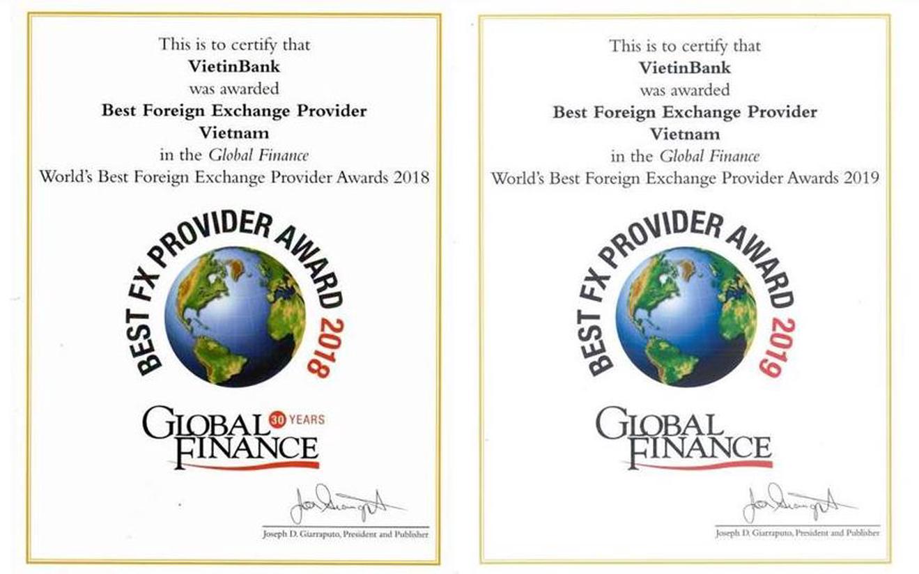 VietinBank nhận giải thưởng Ngân hàng cung cấp dịch vụ ngoại hối tốt nhất Việt Nam do Tạp chí uy tín thế giới Global Finance trao tặng năm 2018 và 2019