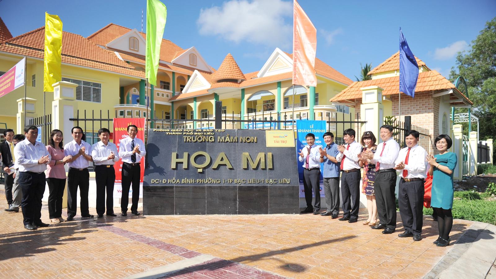 Bên cạnh đó, VietinBank còn hỗ trợ kinh phí 10 tỷ đồng để xây dựng công trình Trường Mẫu giáo Họa Mi giúp cho các cháu nhỏ có nơi học tập, vui chơi và phát triển trí tuệ, thể chất. Phát biểu tại Lễ bàn giao, Chủ tịch HĐQT VietinBank ông Nguyễn Văn Thắng bày tỏ niềm vui khi nhìn thấy công trình có sự đóng góp kinh phí của VietinBank được chính quyền địa phương xây dựng khang trang và bền vững. Ông nhấn mạnh: Đây là công trình Chào mừng Đại hội Đảng các cấp do VietinBank đầu tư tài trợ đối với địa phương. Chúng tôi hy vọng rằng với ngôi trường mới này, thầy cô giáo và các em học sinh sẽ có điều kiện tốt hơn để “Dạy tốt, học tốt”, góp phần kế tục và phát huy những truyền thống lịch sử tốt đẹp của cha ông trong sự nghiệp xây dựng, phát triển quê hương Bạc Liêu ngày càng giàu đẹp.
