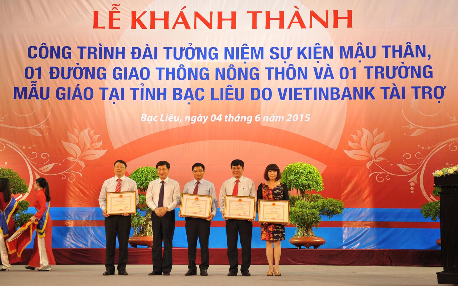 Biểu dương và ghi nhận sự đóng góp to lớn của VietinBank đối với công tác an sinh xã hội tại tỉnh Bạc Liêu, Lãnh đạo tỉnh đã trao tặng Kỷ niệm chương cho VietinBank và Bằng khen cho các Lãnh đạo VietinBank: ông Nguyễn Văn Thắng - Chủ tịch HĐQT VietinBank; ông Lê Đức Thọ - Tổng Giám đốc VietinBank; ông Nguyễn Văn Du - Phó Tổng Giám đốc, Chủ tịch Công đoàn VietinBank… cùng tập thể cán bộ nhân viên, ban Giám đốc VietinBank Bạc Liêu.