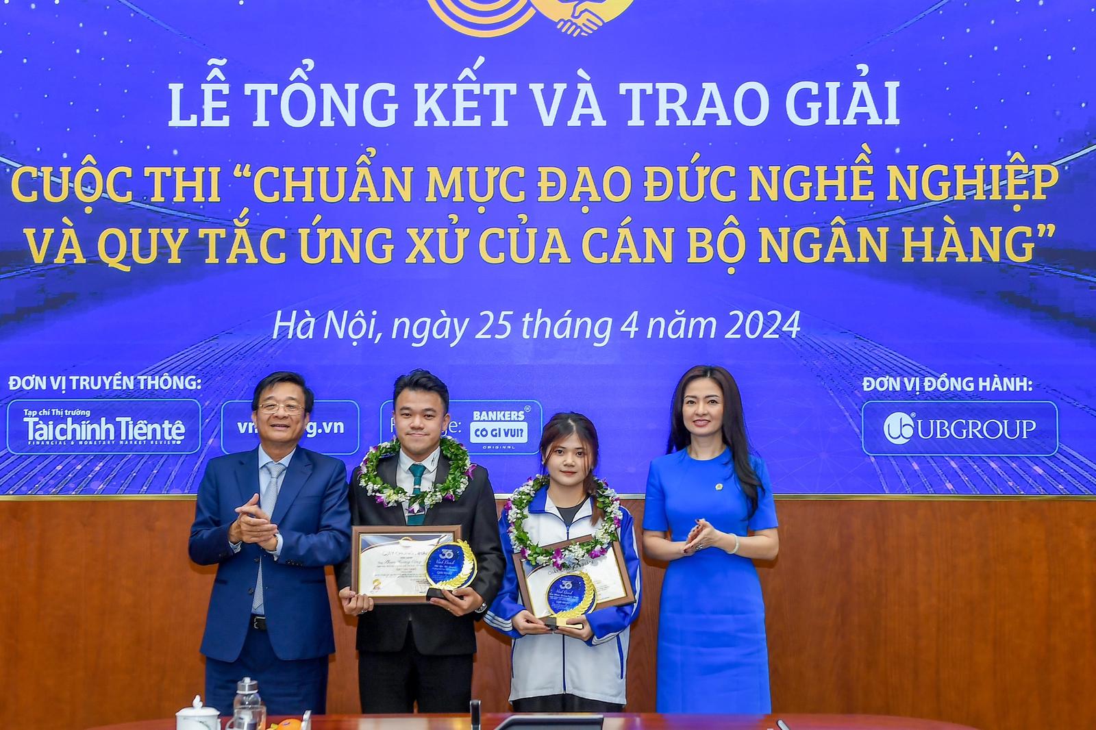 Ông Nguyễn Quốc Hùng và bà Nguyễn Khánh Chi trao giải cho 2 thí sinh đạt giải Nhất chung cuộc khối ngân hàng và khối sinh viên. Ảnh: TBNH